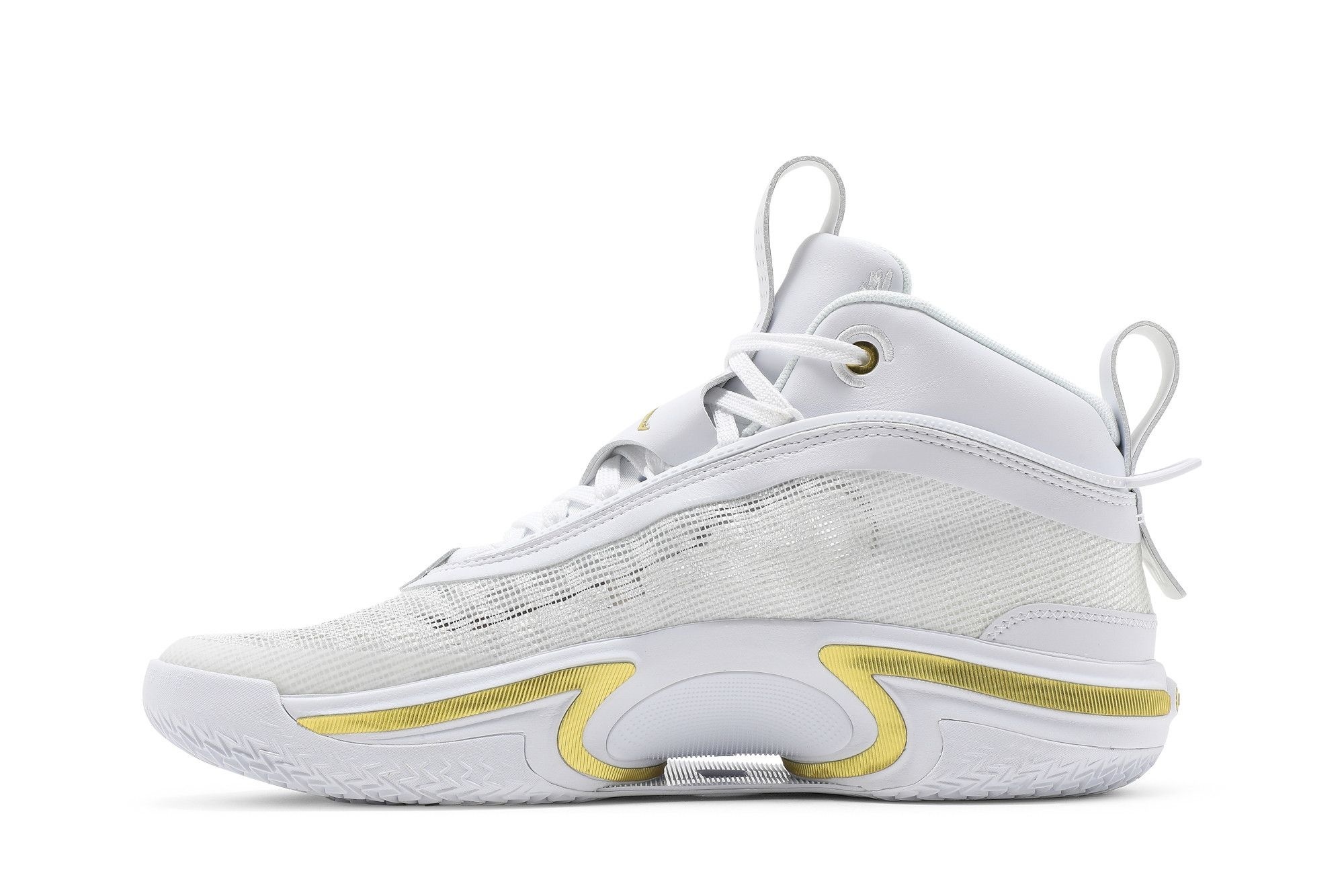 Jordan Air Jordan 36 SE Glory (DJ4482-100) sneakers. White/Metallic Gold-Black. Premium comfort & performance. Breathable mesh, Zoom Air, Cushlon midsole. Exceptional traction. A stylish & athletic statement.