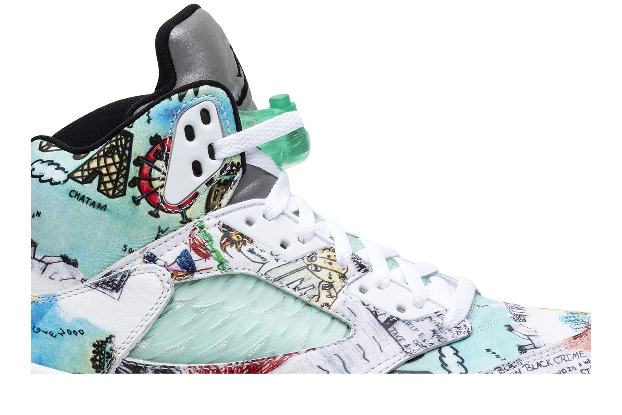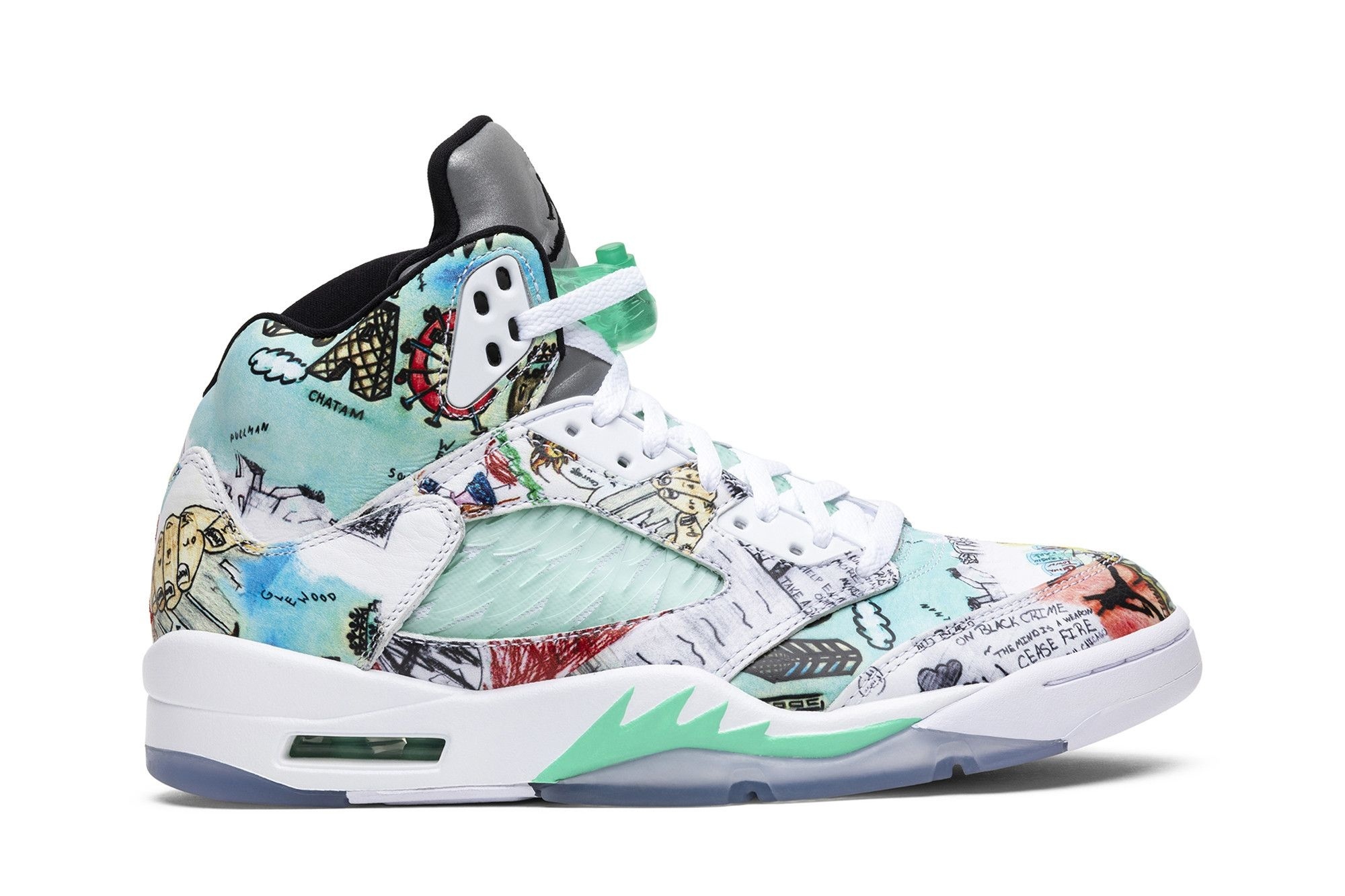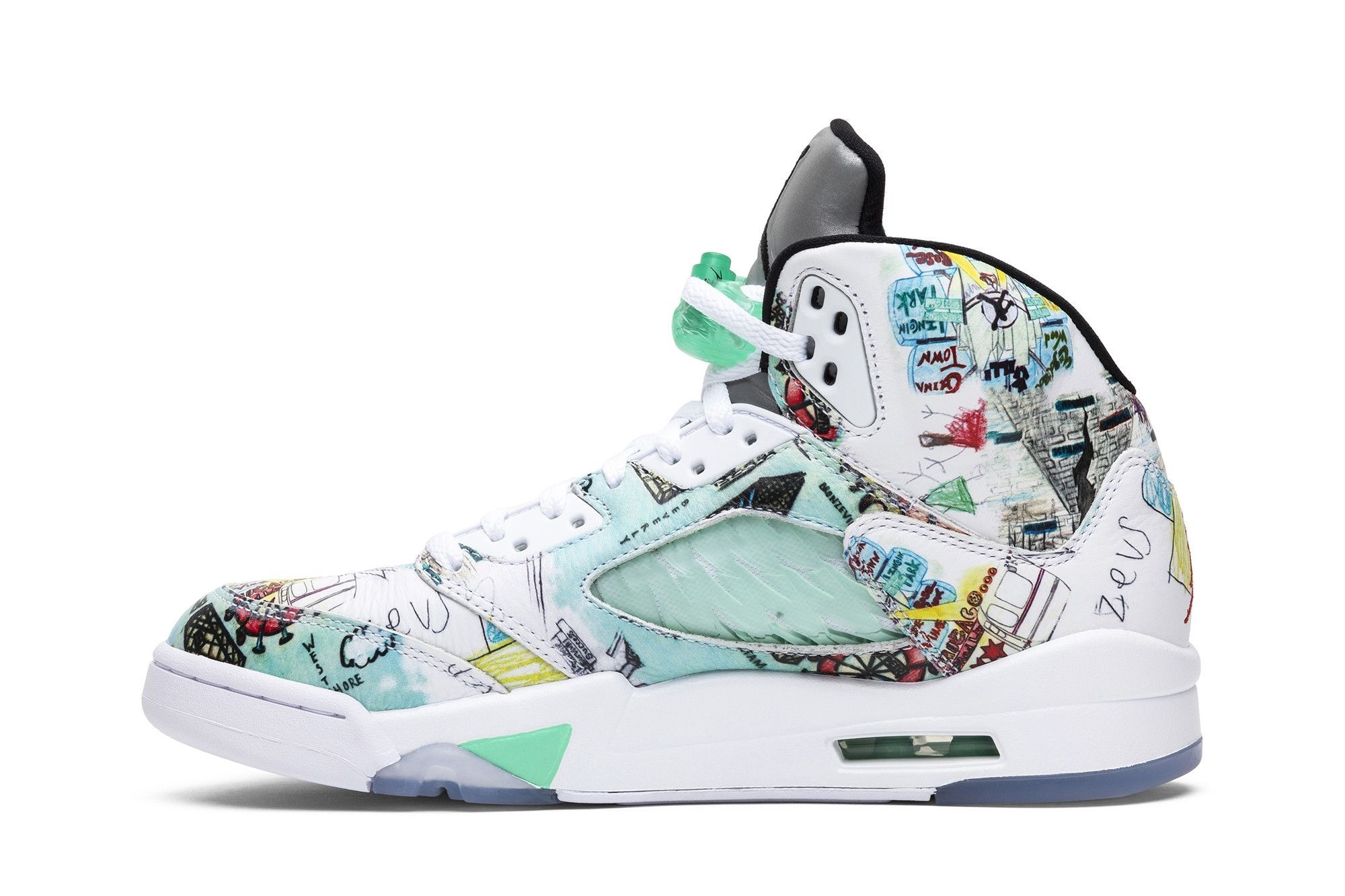 Jordan Brand’s iconic Air Jordan 5 Retro Wings (AV2405-900). Multi-colour design, featuring unique child-drawn artwork. Limited edition release, white leather upper with green accents. A must-have for sneaker collectors.