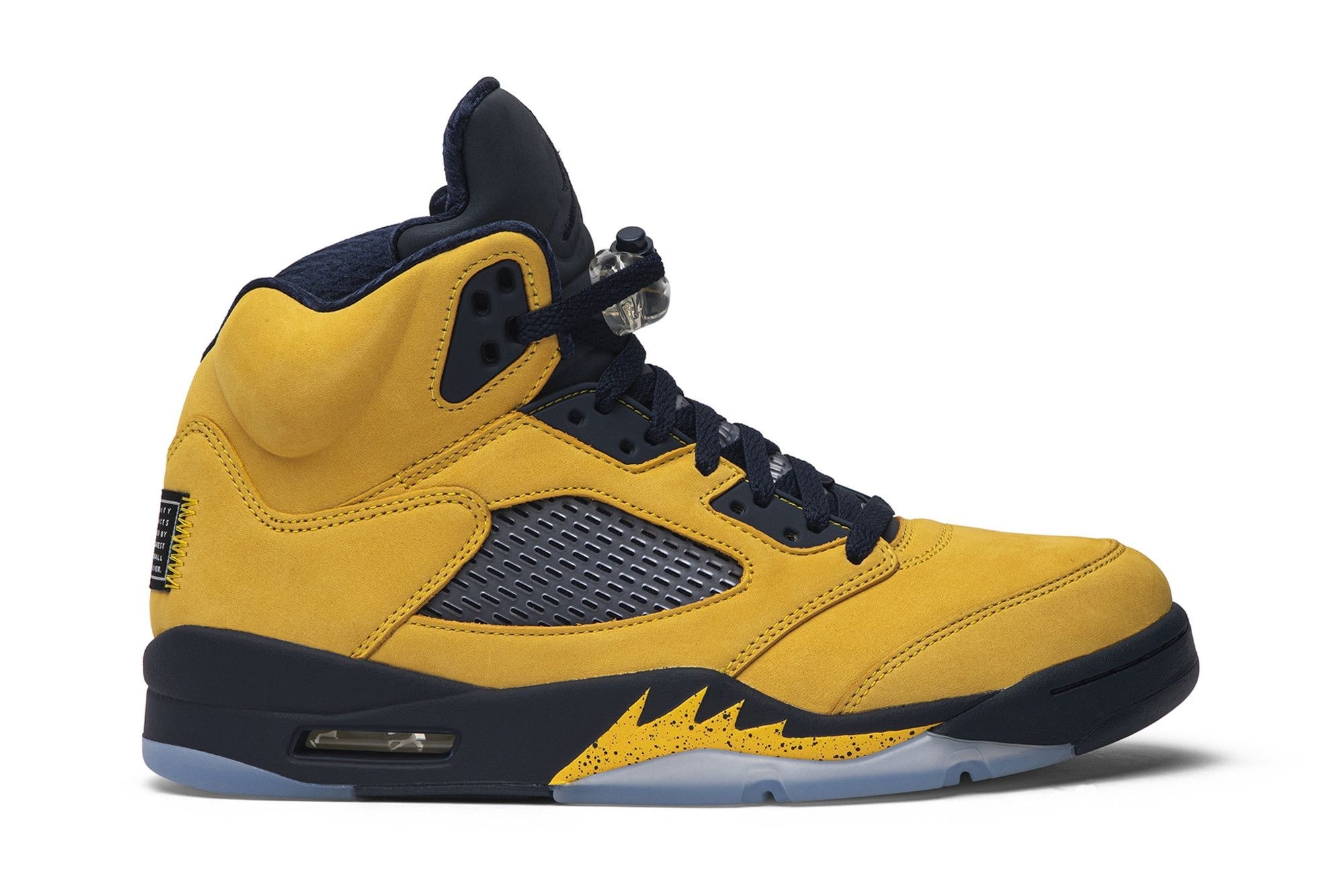 Iconic Air Jordan 5 Retro Michigan (2019) sneakers. CQ9541-704. Premium nubuck, navy & yellow design, reflective tongue. Limited edition release celebrating University of Michigan. A must-have for collectors. Jordan Brand.