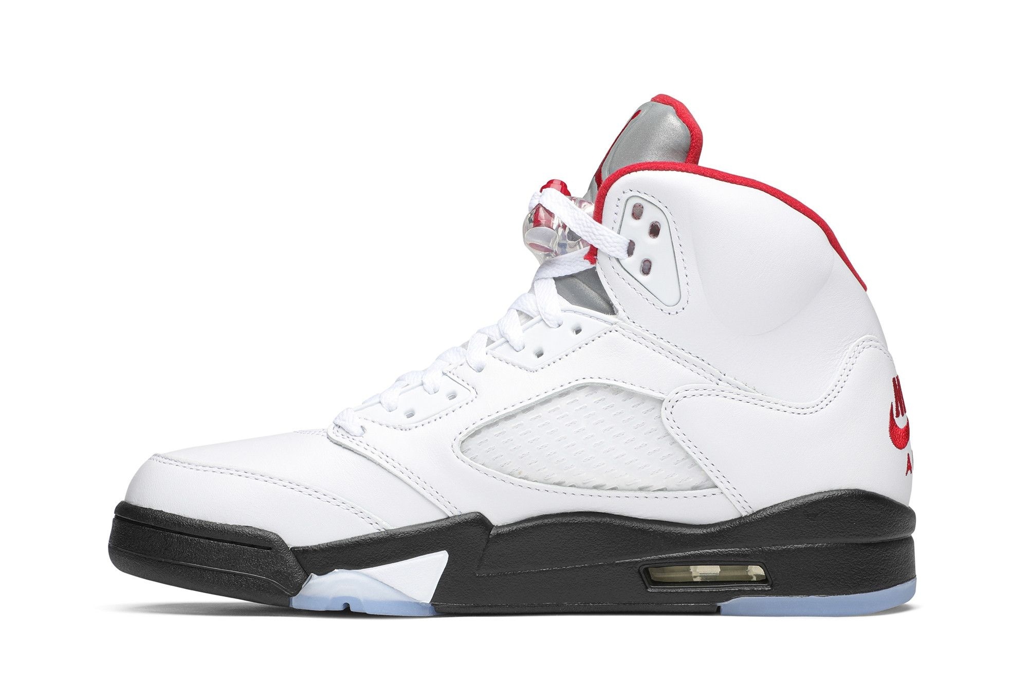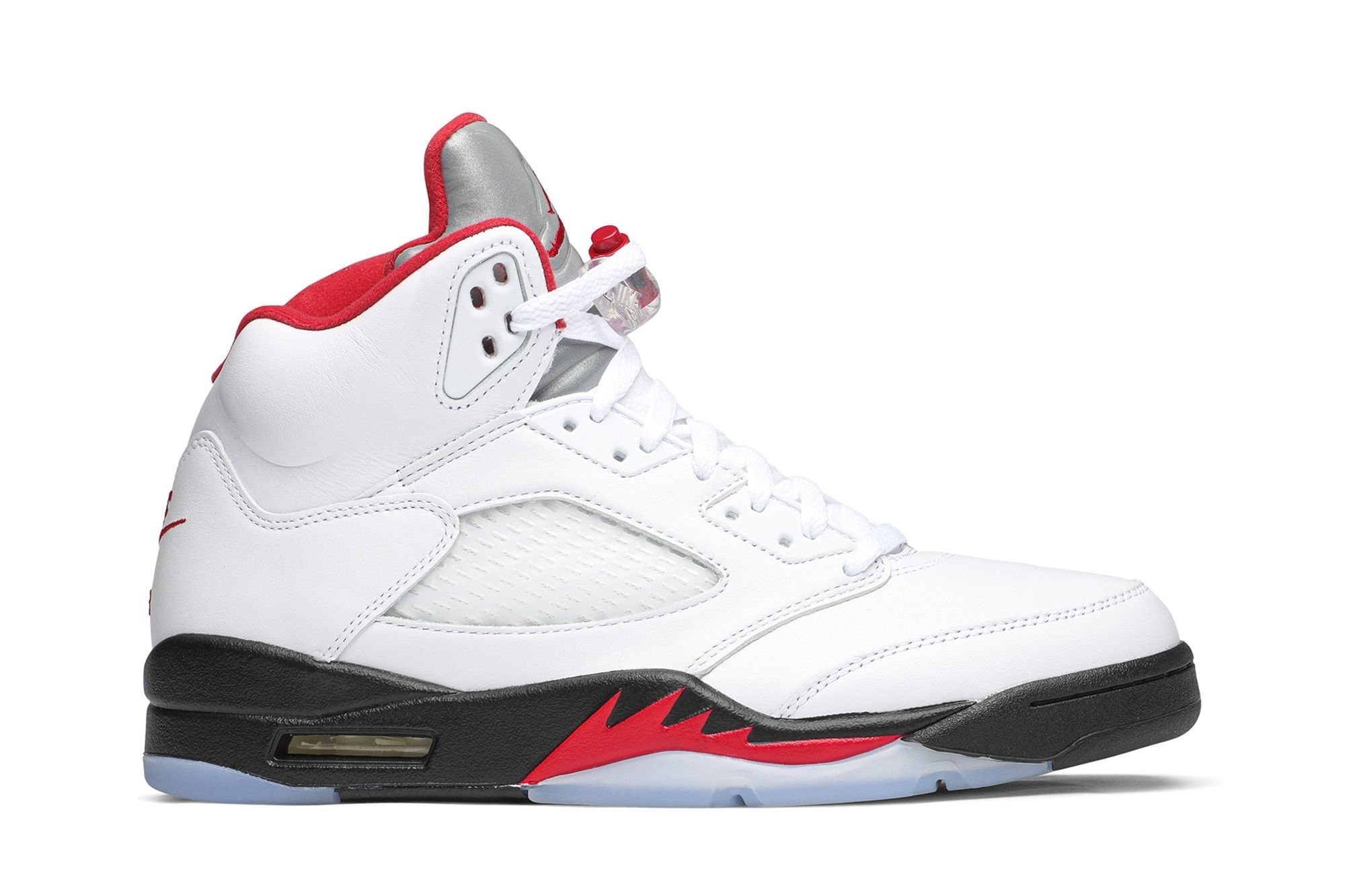 Jordan Brand Jordan 5 Retro Fire Red Silver Tongue (2020), DA1911-102. Remastered classic sneaker with white leather upper, fire red accents, and reflective silver tongue. A must-have for collectors.