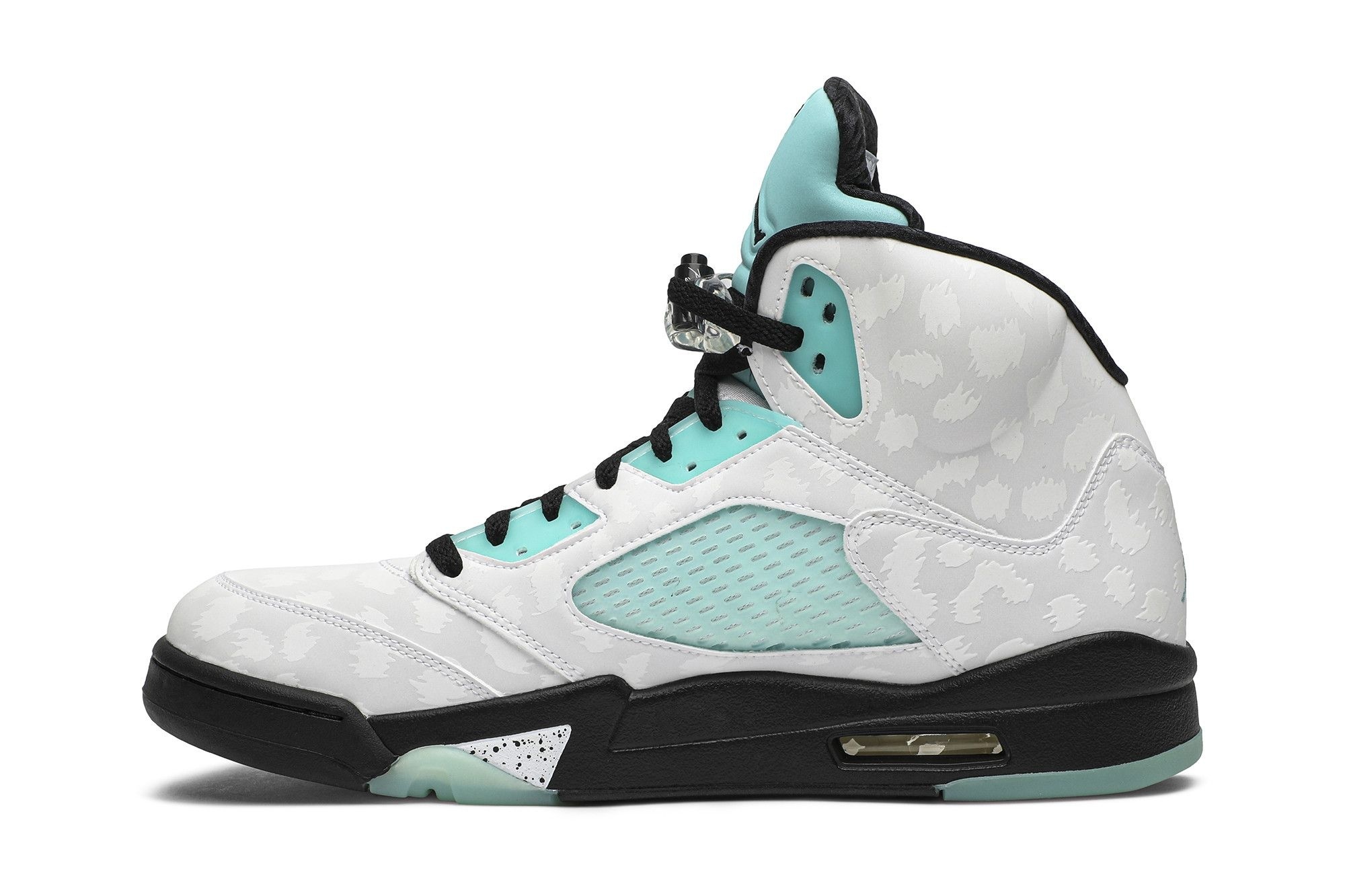Jordan Brand Jordan 5 Retro Island Green (CN2932-100). Limited edition sneakers. White leather upper with Island Green & black accents. Features Air cushioning. Released November 2019.