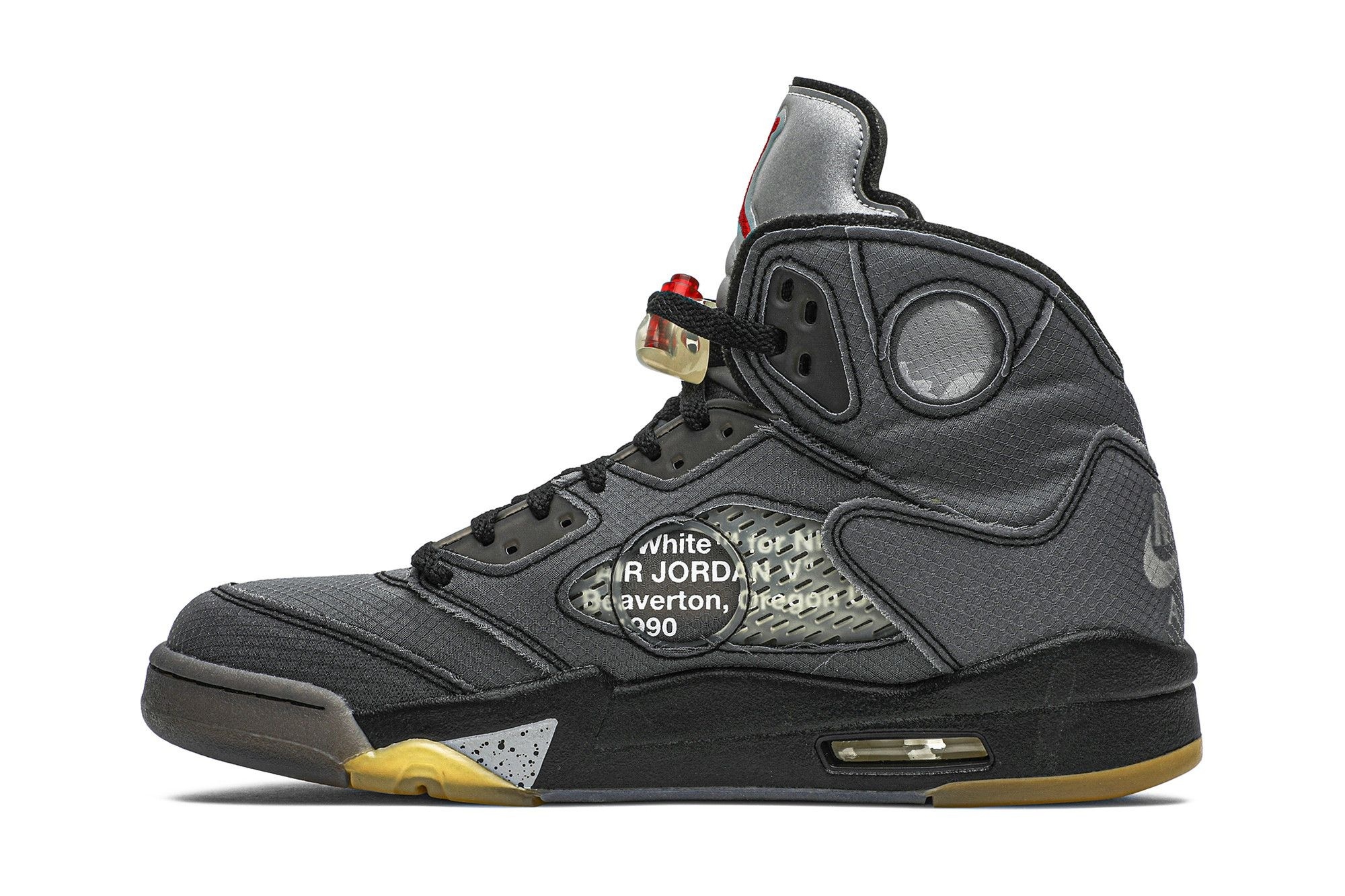 Jordan Brand Jordan 5 Retro Off-White Muslin (CT8480-001). Limited edition sneakers, a Virgil Abloh design. Black textile upper, translucent panels & 3M reflective details. Iconic fusion of streetwear & high-fashion.