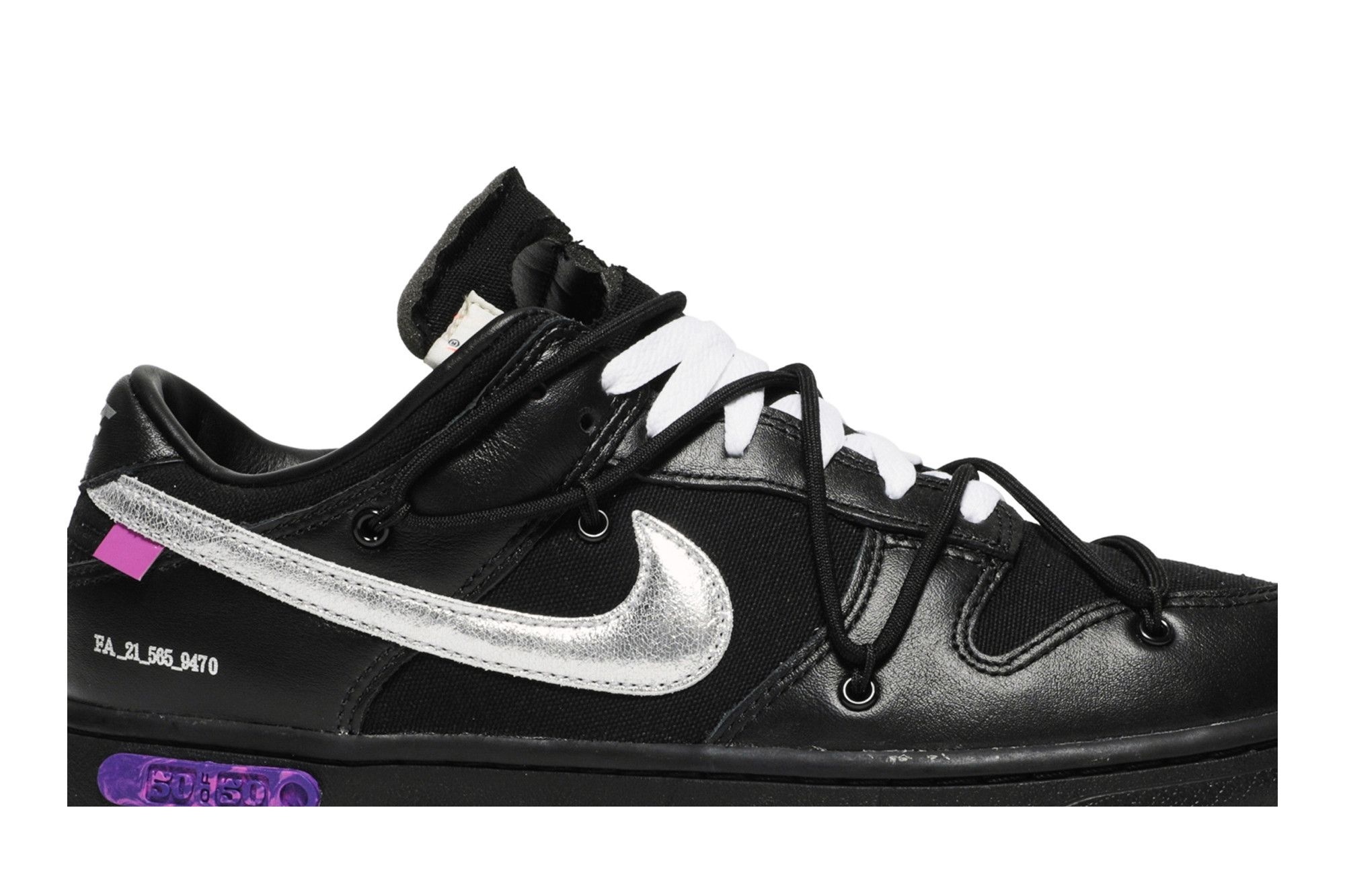 Dunk Low Off-White Lot 50 (DM1602-001). Limited edition black & metallic silver sneakers. Premium leather & canvas. Iconic collaboration. A must-have for collectors & sneakerheads.