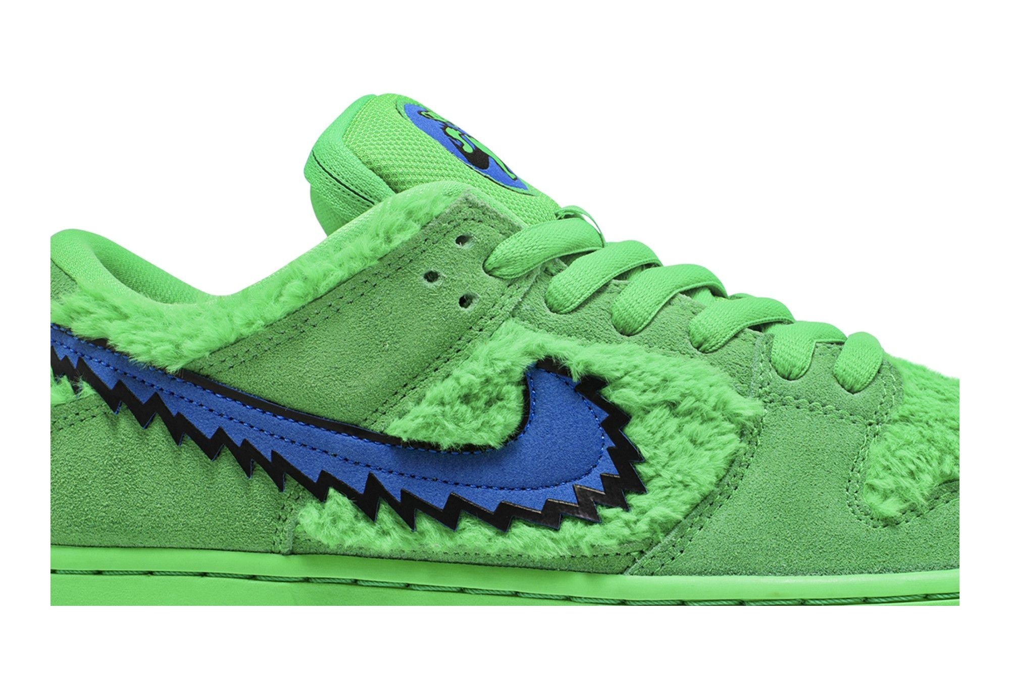 SB Dunk Low Grateful Dead Bears Green (CJ5378-300). Limited edition collab featuring plush green faux fur, suede overlays, & hidden stash pocket. Iconic Grateful Dead bears design. A must-have for sneakerheads.