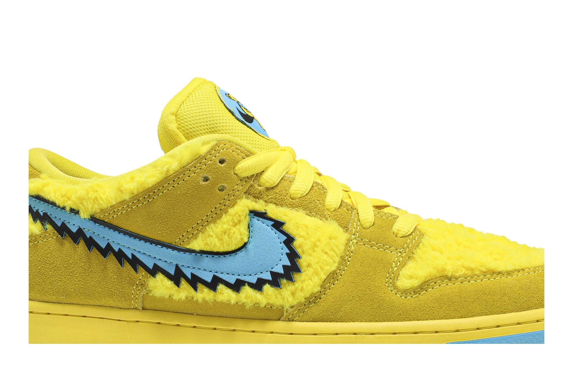 SB Dunk Low Grateful Dead Bears (CJ5378-700). Opti Yellow suede & faux fur upper. Limited edition collab featuring Grateful Dead Dancing Bears. Hidden tongue pocket. Iconic design.