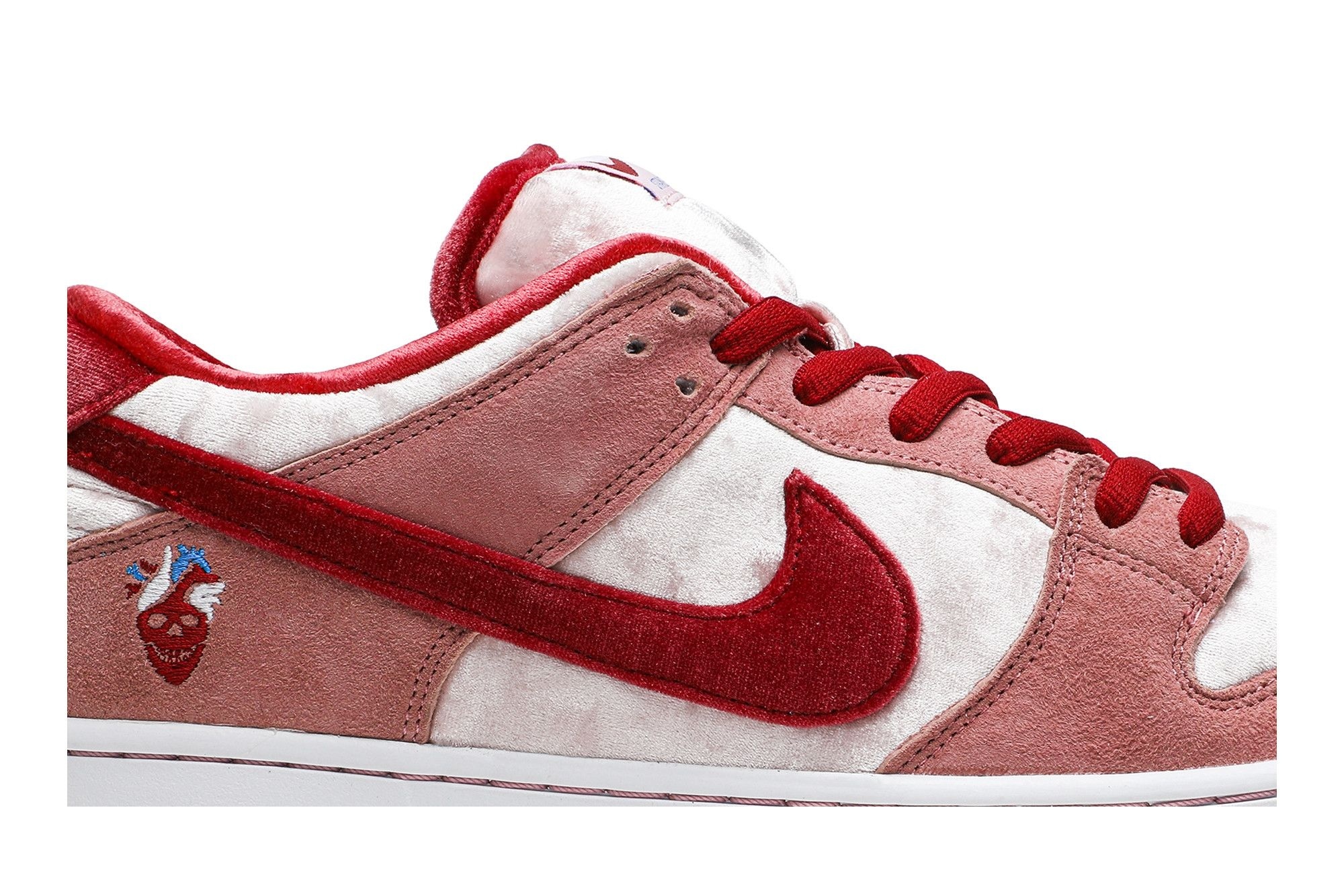 SB Dunk Low StrangeLove Skateboards (Special Box) CT2552-800. Limited-edition pink velvet sneakers with red Swooshes. Includes special packaging, laces, print & stickers. A collector’s item from Todd Bratrud & Sean Cliver.