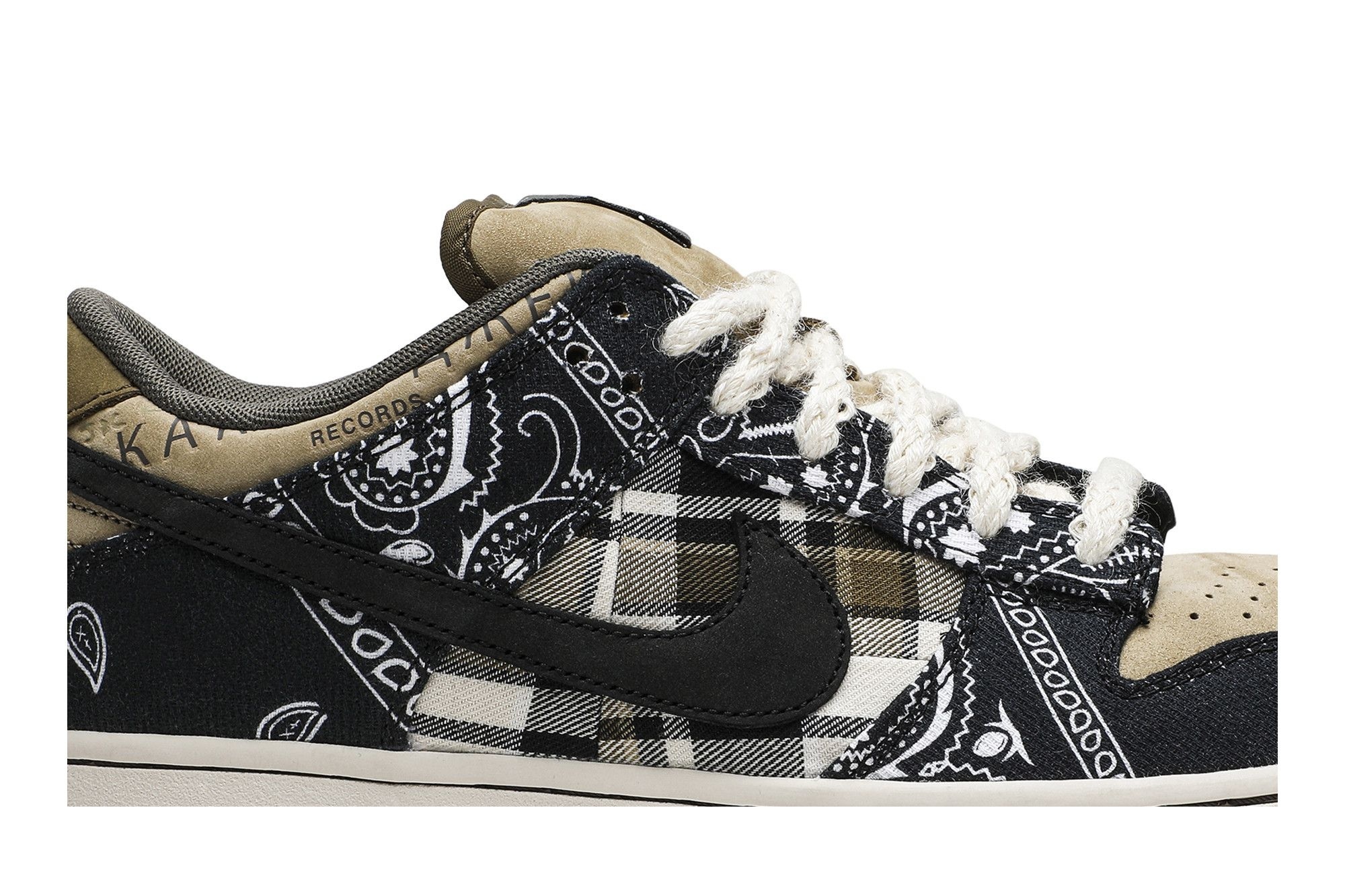 SB Dunk Low Travis Scott sneakers (CT5053-001). Limited edition, black/beige/brown suede with paisley & flannel. Features wear-away reveal & Cactus Jack branding. A must-have for collectors.