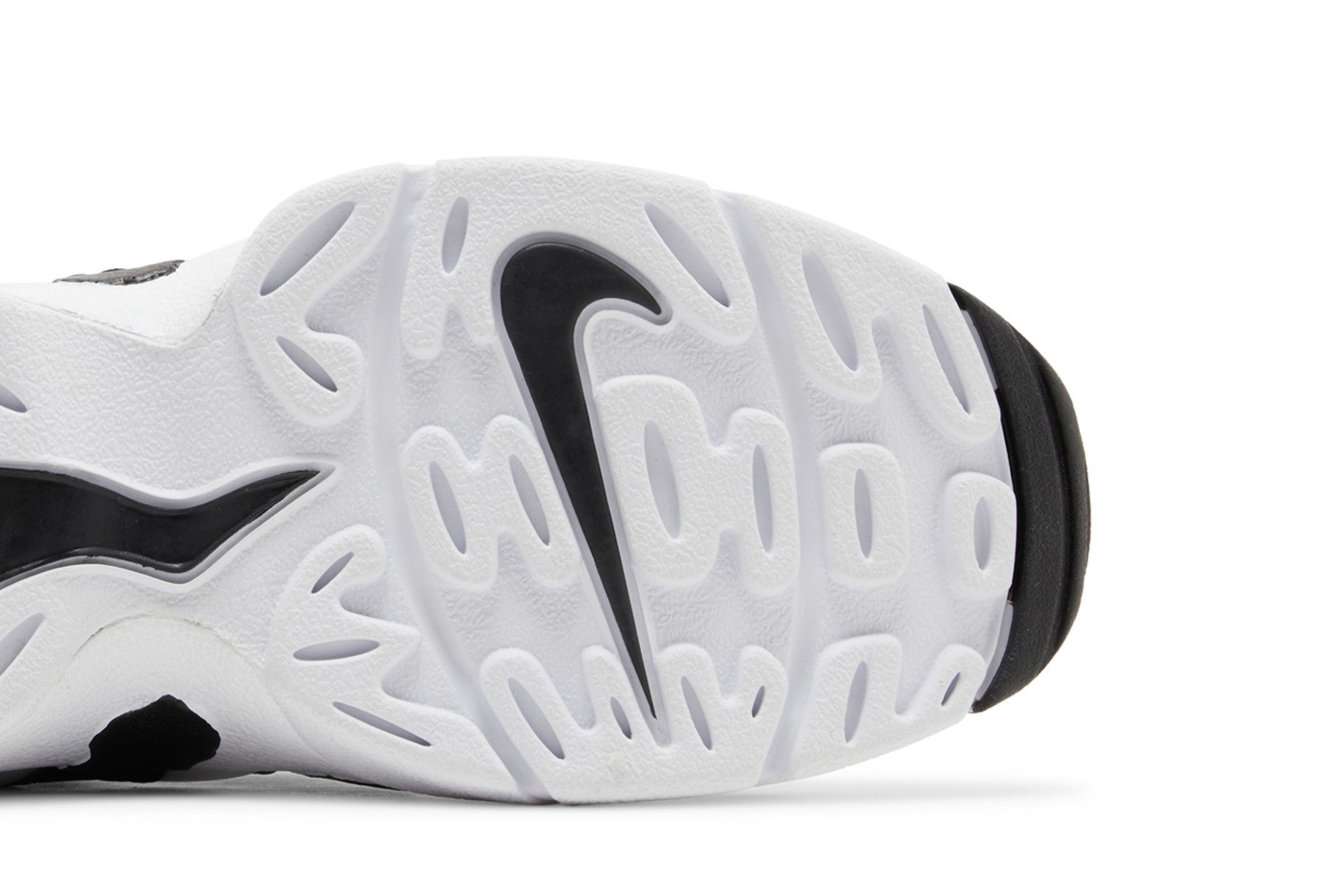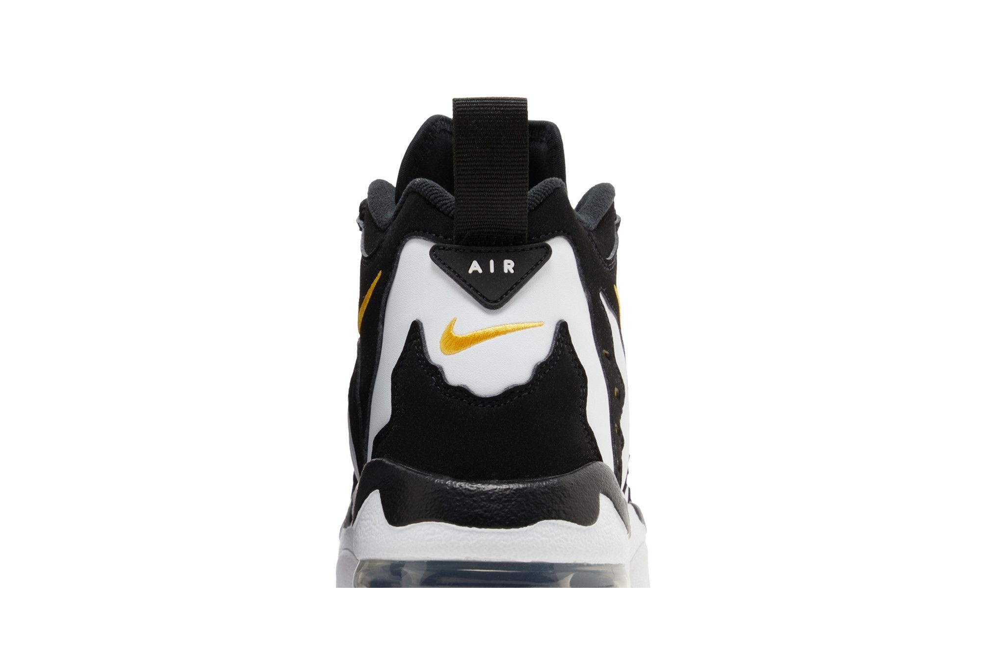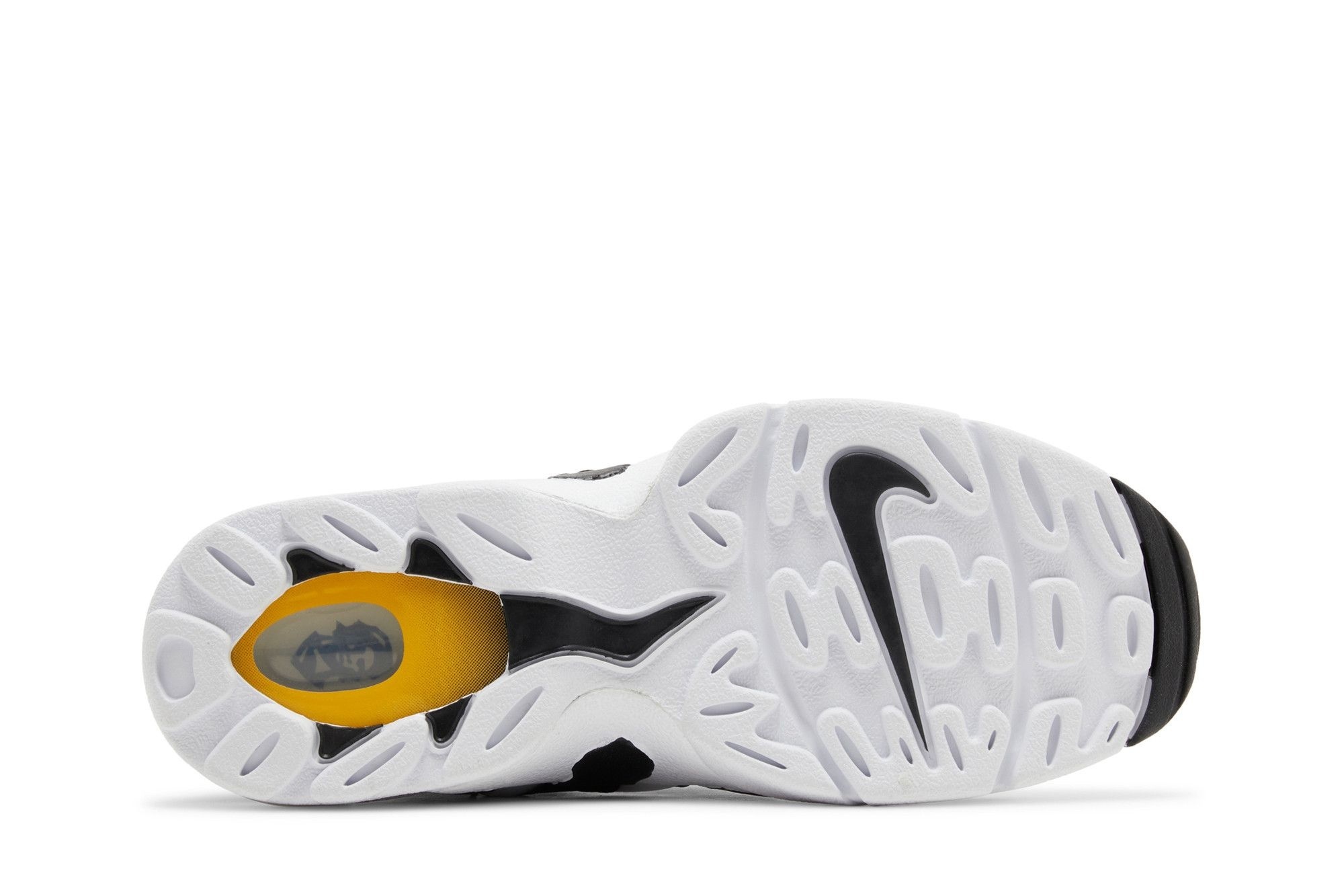 Step back in time with the Air DT Max ’96, a stylish reissue of a 90s classic. This 2024 release boasts a striking design that blends retro appeal with modern comfort. The predominantly white leather upper provides a clean foundation, beautifully contrasted by bold black leather overlays that create a unique “dripping” effect, extending from the upper down the midsole and into the outsole. This eye-catching feature is further enhanced by subtle Varsity Maize yellow accents peeking through perforations in the black overlays and featured on the heel and tongue branding.