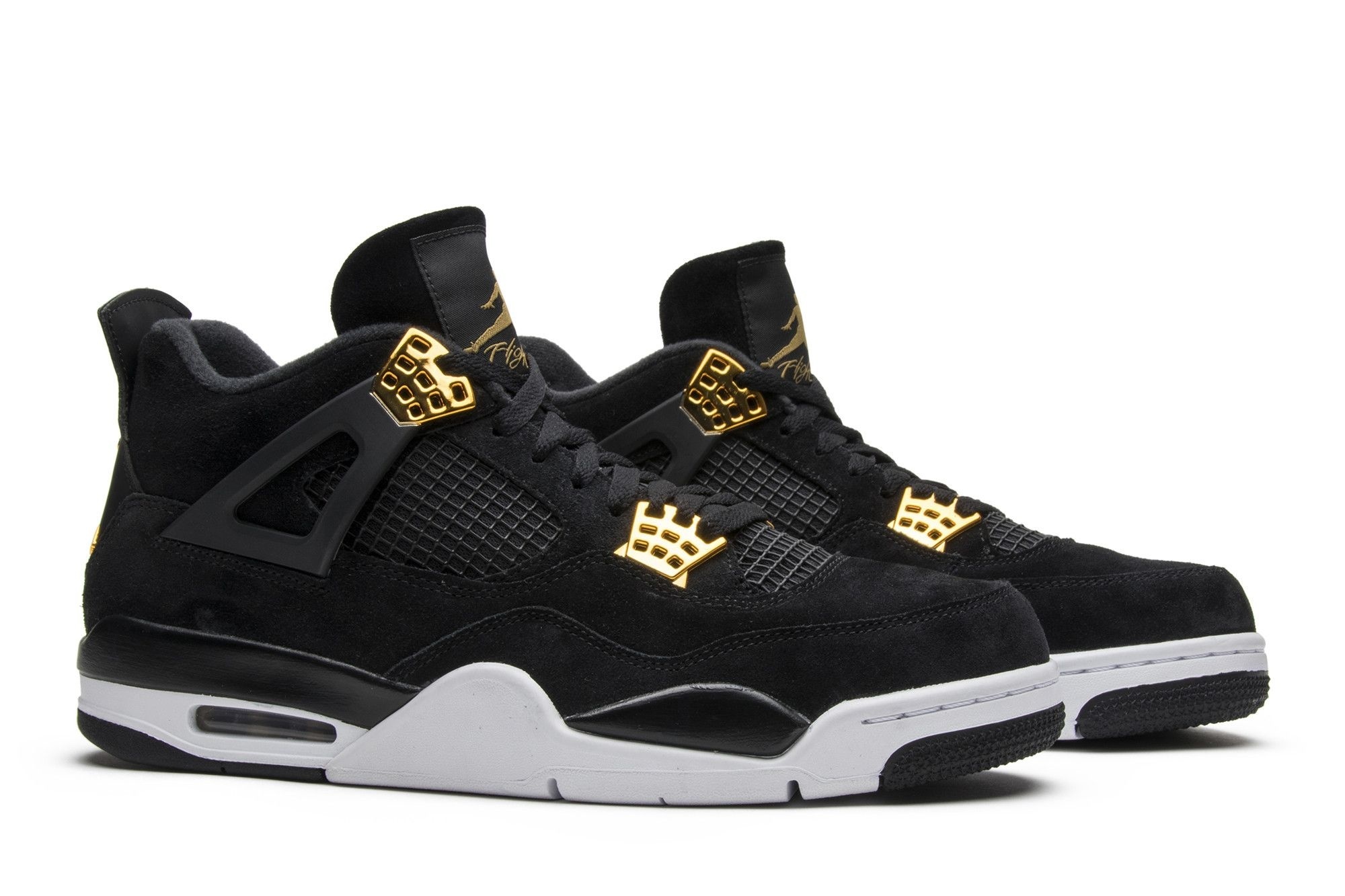 Experience royal style with the Air Jordan 4 Retro Royalty sneakers. These iconic kicks boast a sophisticated black suede upper, accented by luxurious metallic gold detailing. The combination of black and gold creates a timeless look perfect for elevating any outfit.