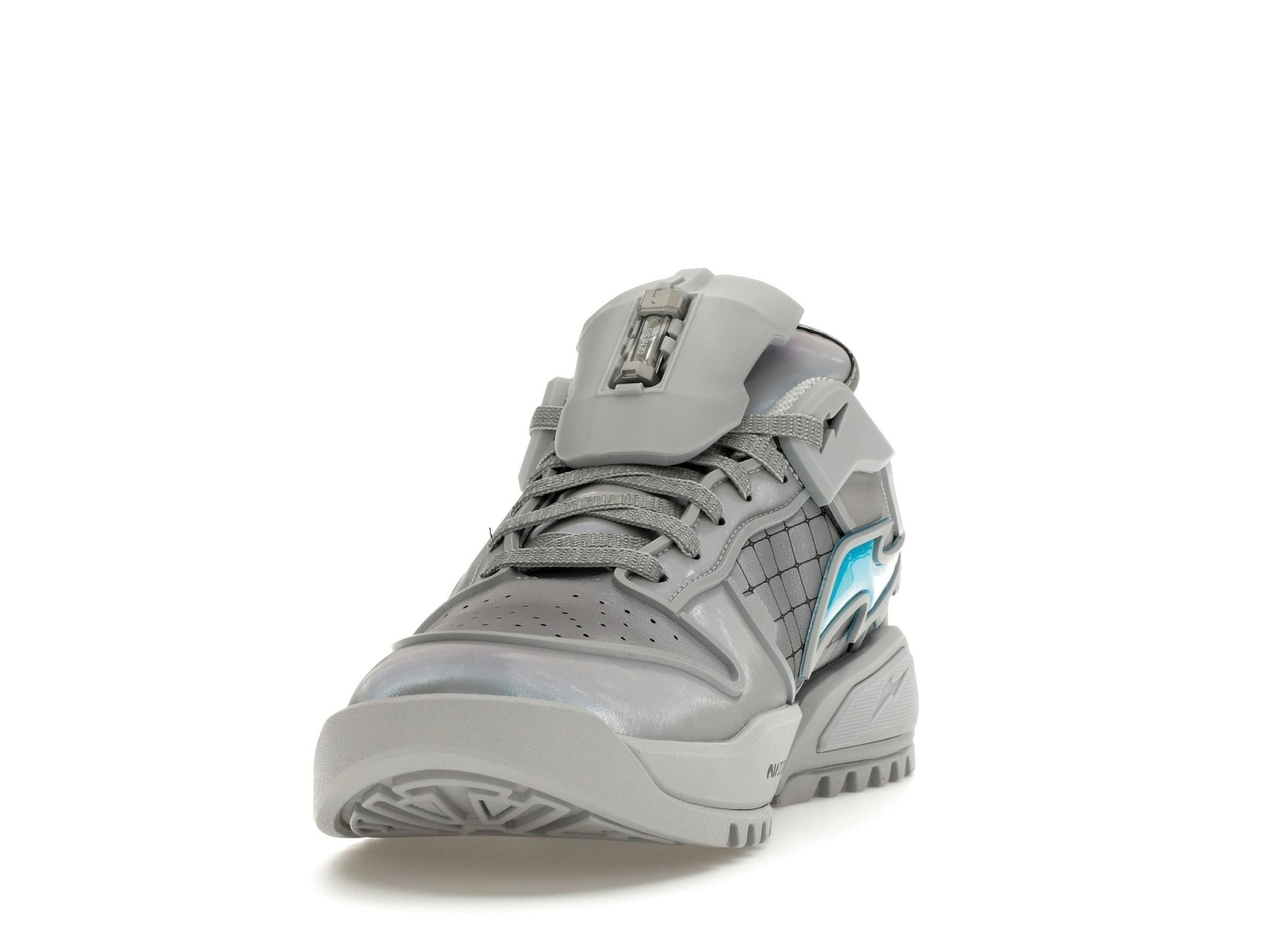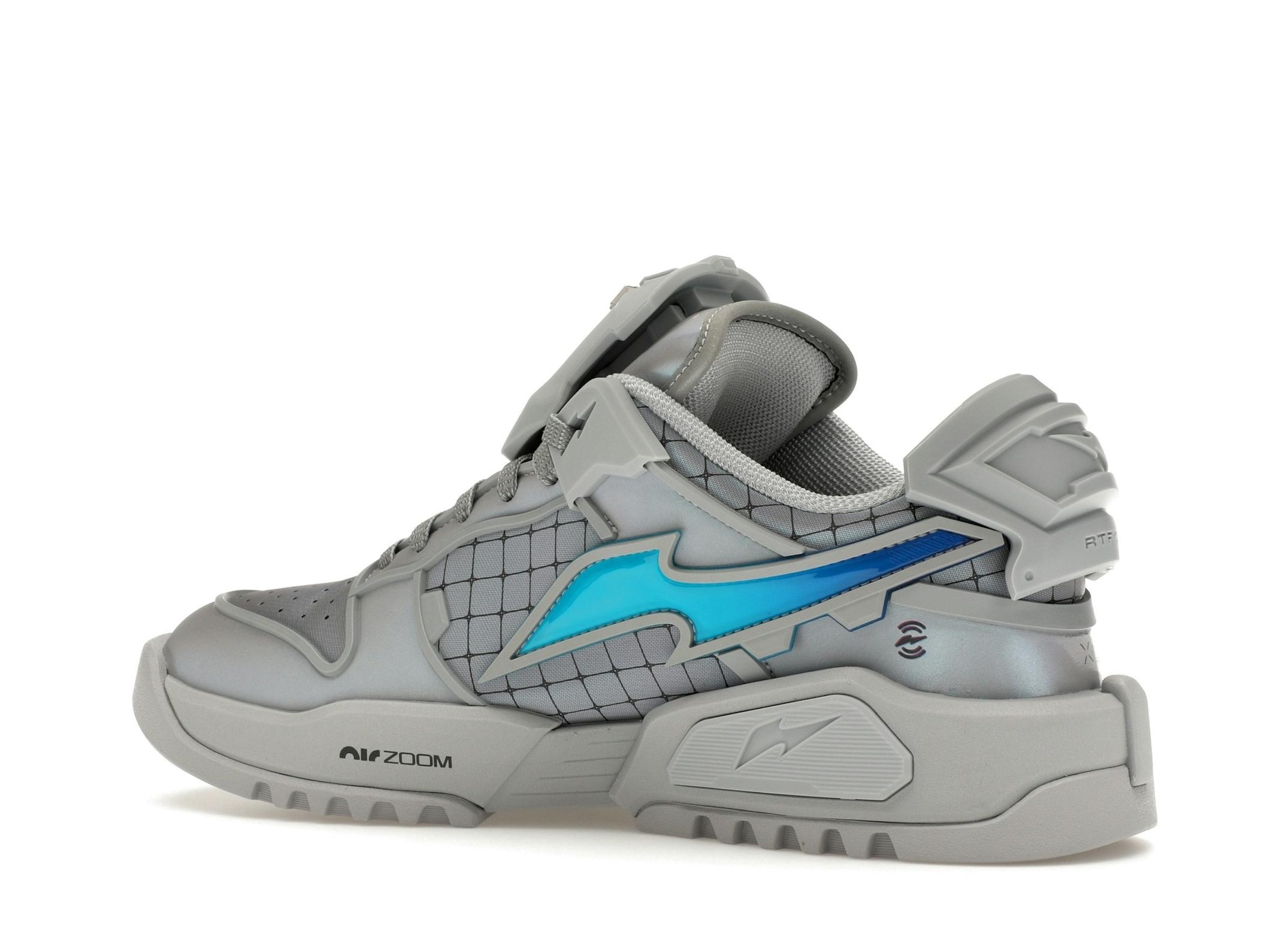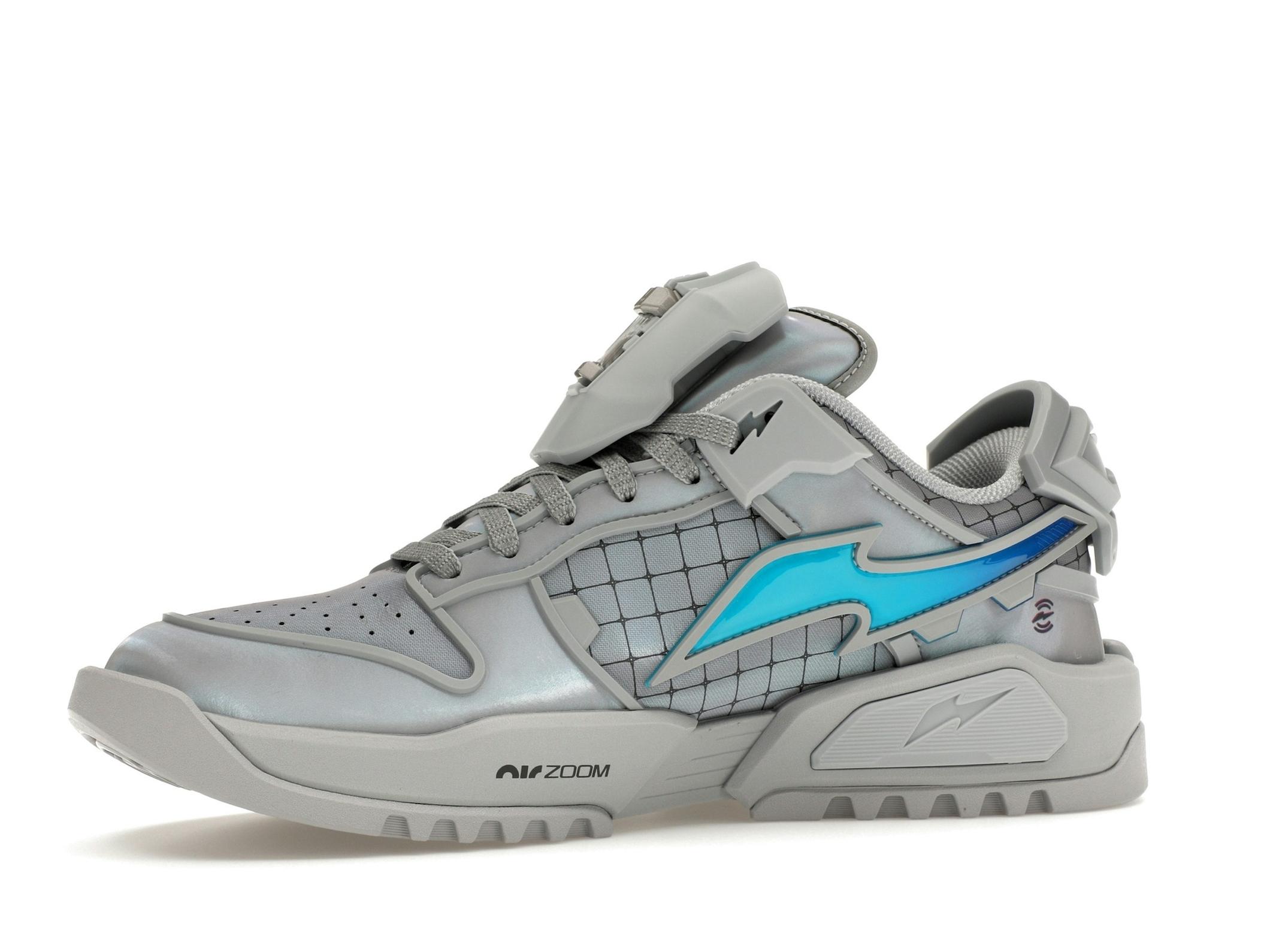The upper features a sleek Wolf Grey finish with an eye-catching iridescent effect. The iconic Swoosh logo showcases a striking color gradient, transitioning from Photo Blue to a lighter shade of blue, adding a vibrant pop of color to the overall design. The futuristic appeal is further enhanced by removable heel, eyelet, and lace cage modifications, crafted in Wolf Grey. These modular components resemble spaceship elements, allowing you to customize your look and express your individuality.