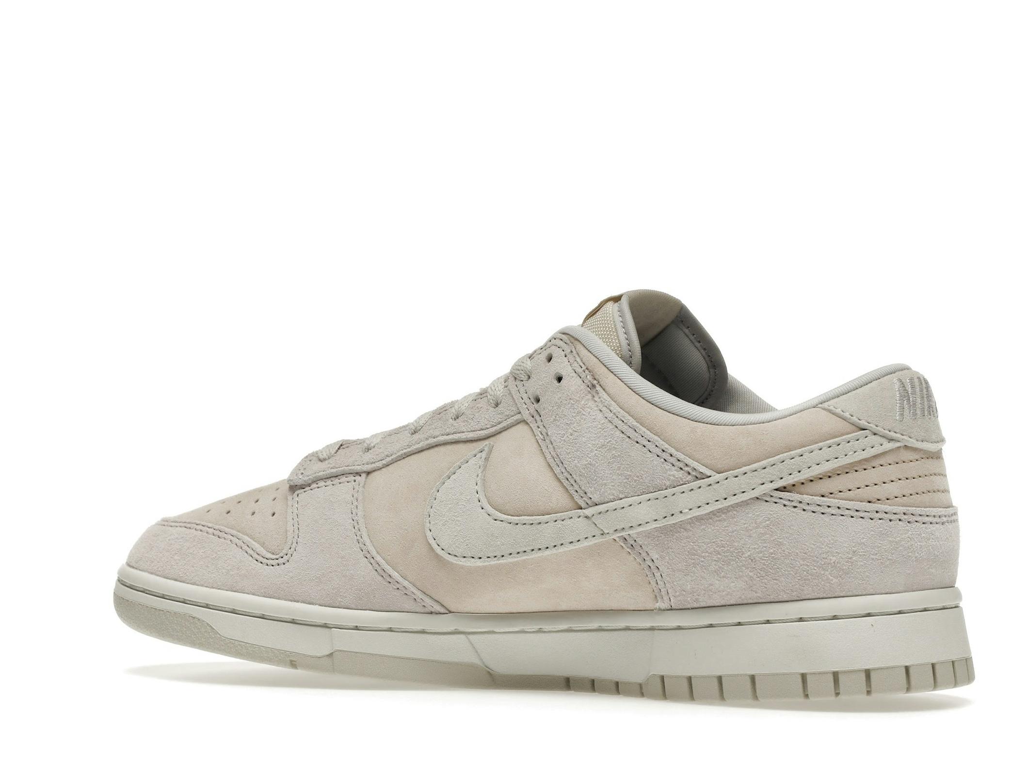 The upper is crafted from premium suede in a tonal grey palette. Subtle variations in the grey hues create visual depth, with warmer tones forming the base and cooler tones highlighting the overlays. This thoughtful use of color blocking adds a touch of refinement to the classic Dunk silhouette.