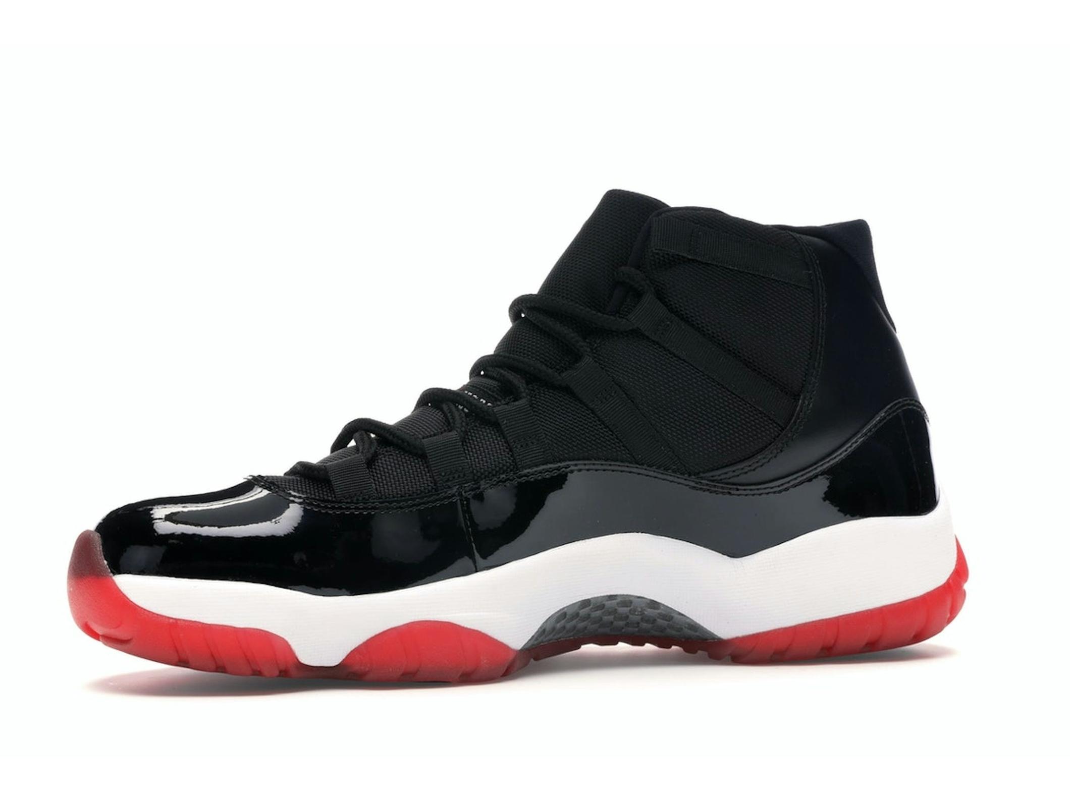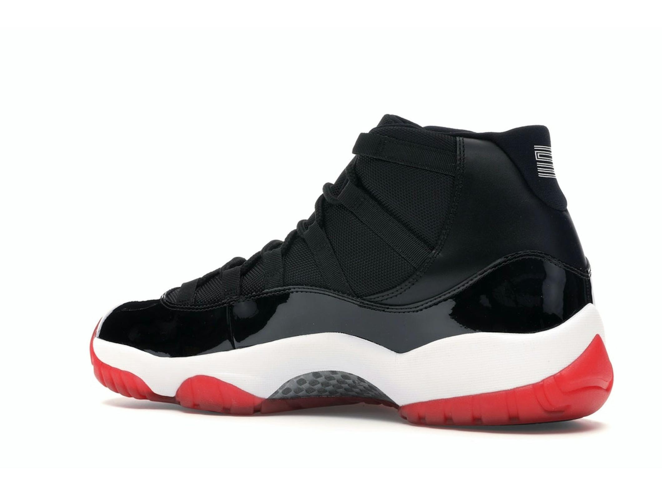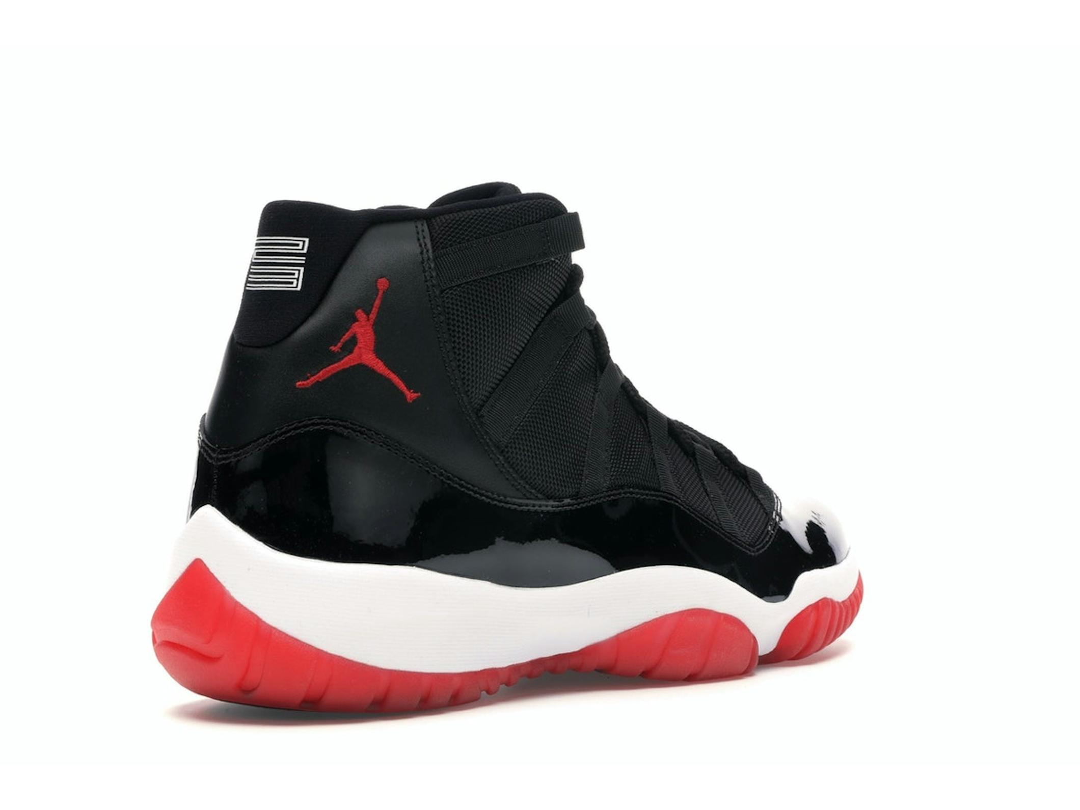 Featuring a sleek black mesh upper, complemented by glossy black patent leather overlays, the Jordan 11 “Bred” exudes timeless style. The vibrant Varsity Red Jumpman logo provides a striking contrast, while the crisp white midsole and translucent red outsole complete the shoe’s signature look.