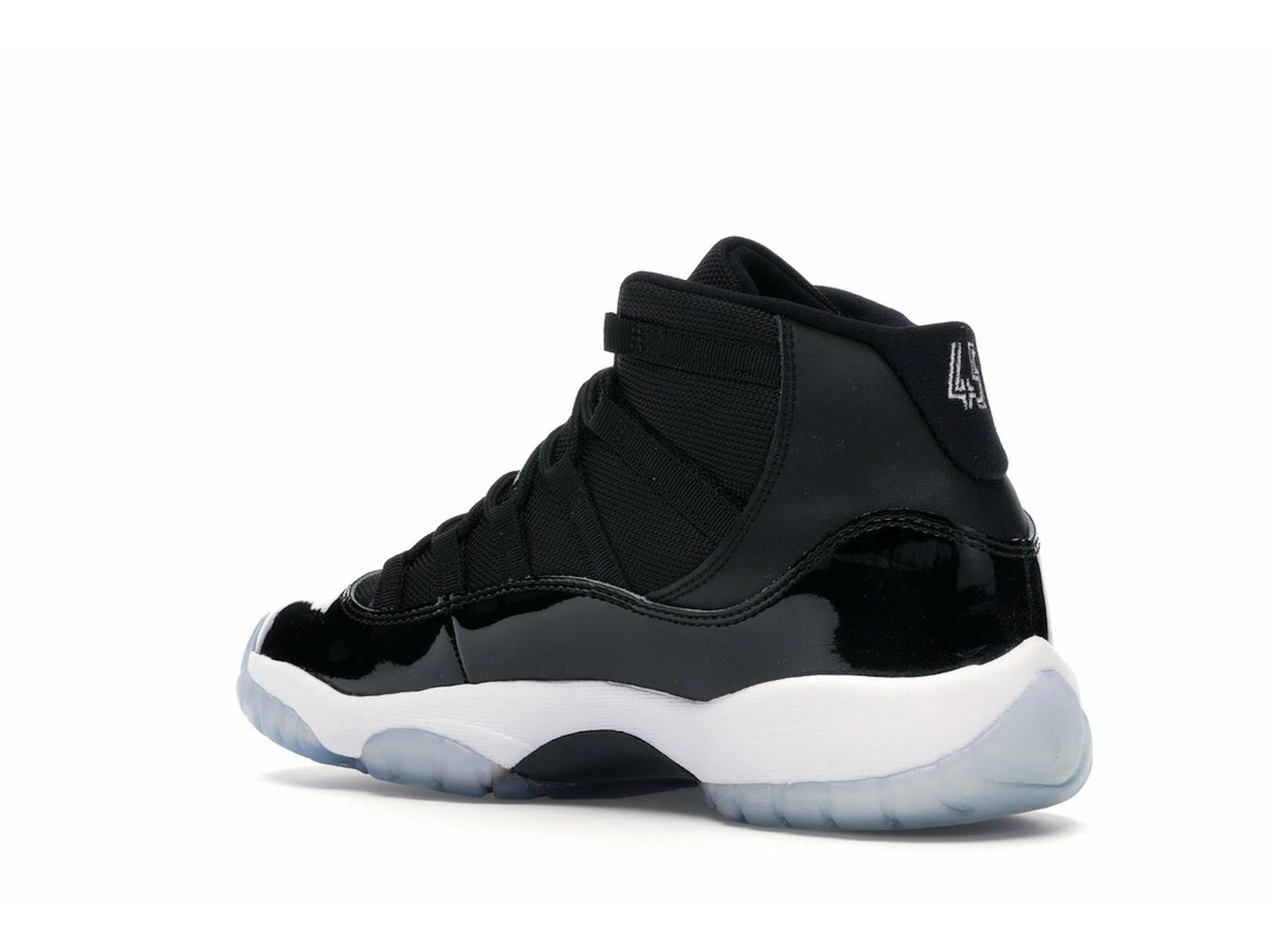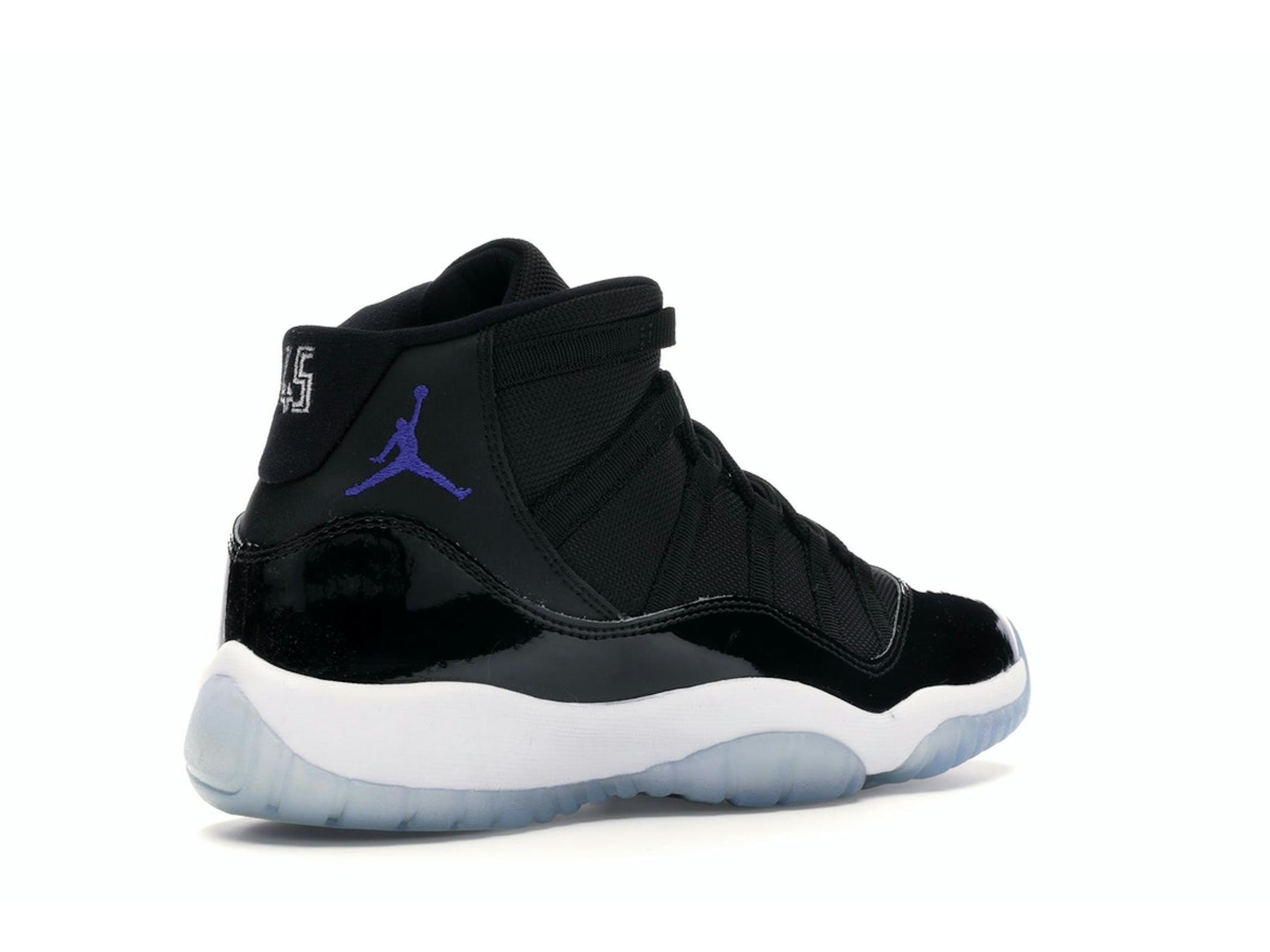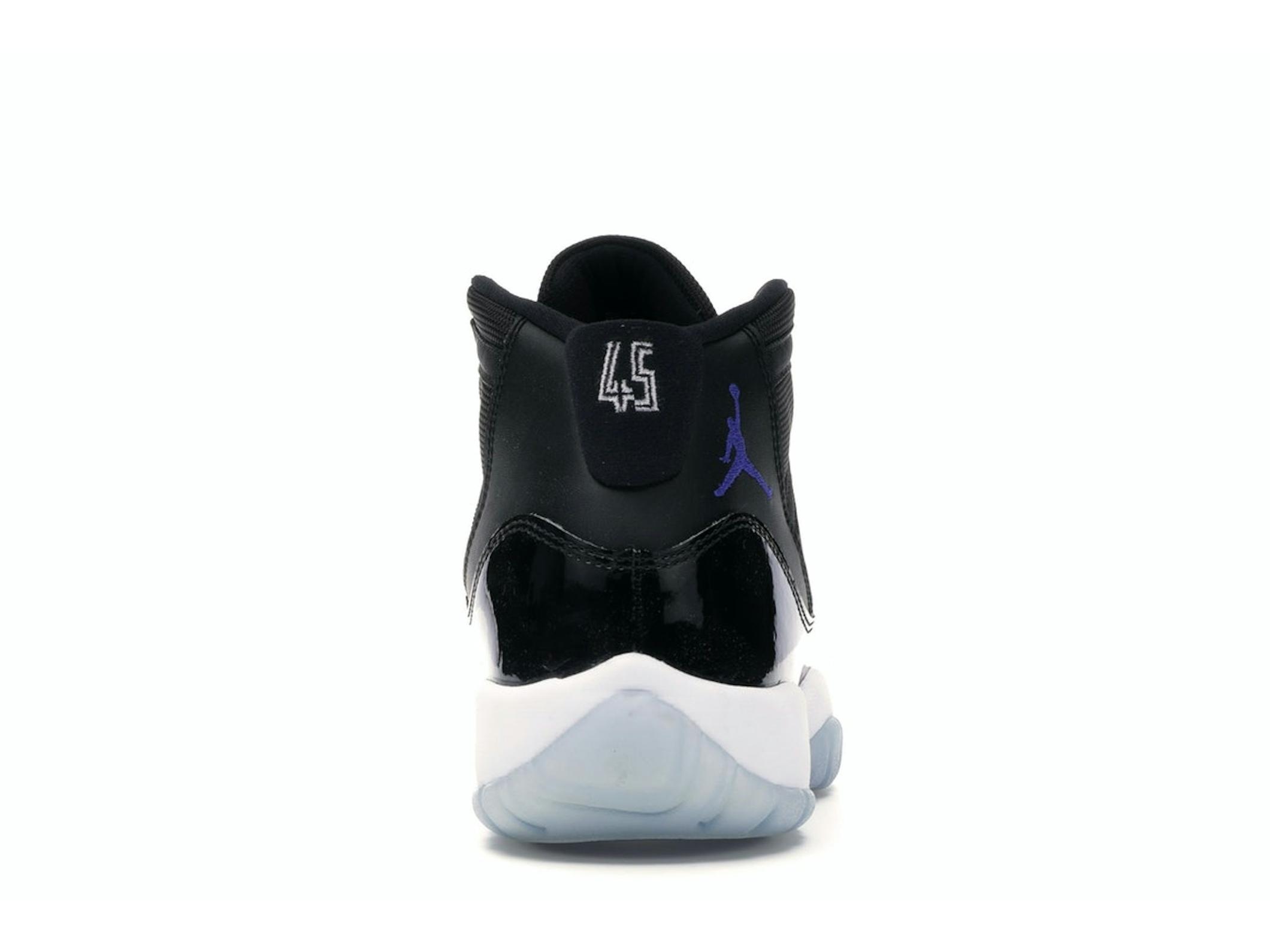 Dressed in a sleek Black/Dark Concord-White colorway, the Jordan 11 Space Jam 2016 GS boasts a premium black upper accented by crisp white details. The iconic Jumpman logo is prominently displayed on the ankle, adding to the shoe’s timeless appeal. The heel proudly displays the “45” inscription, a nod to Michael Jordan’s jersey number during his return to the NBA.