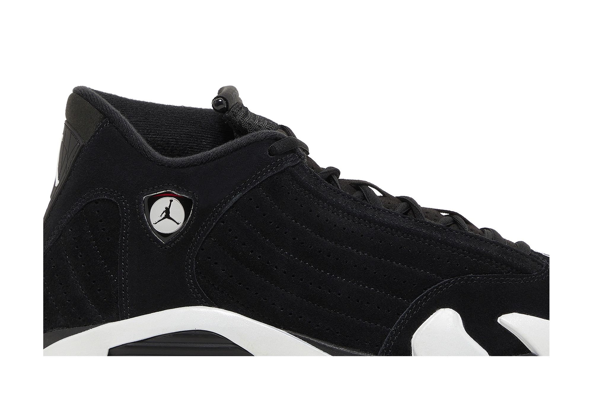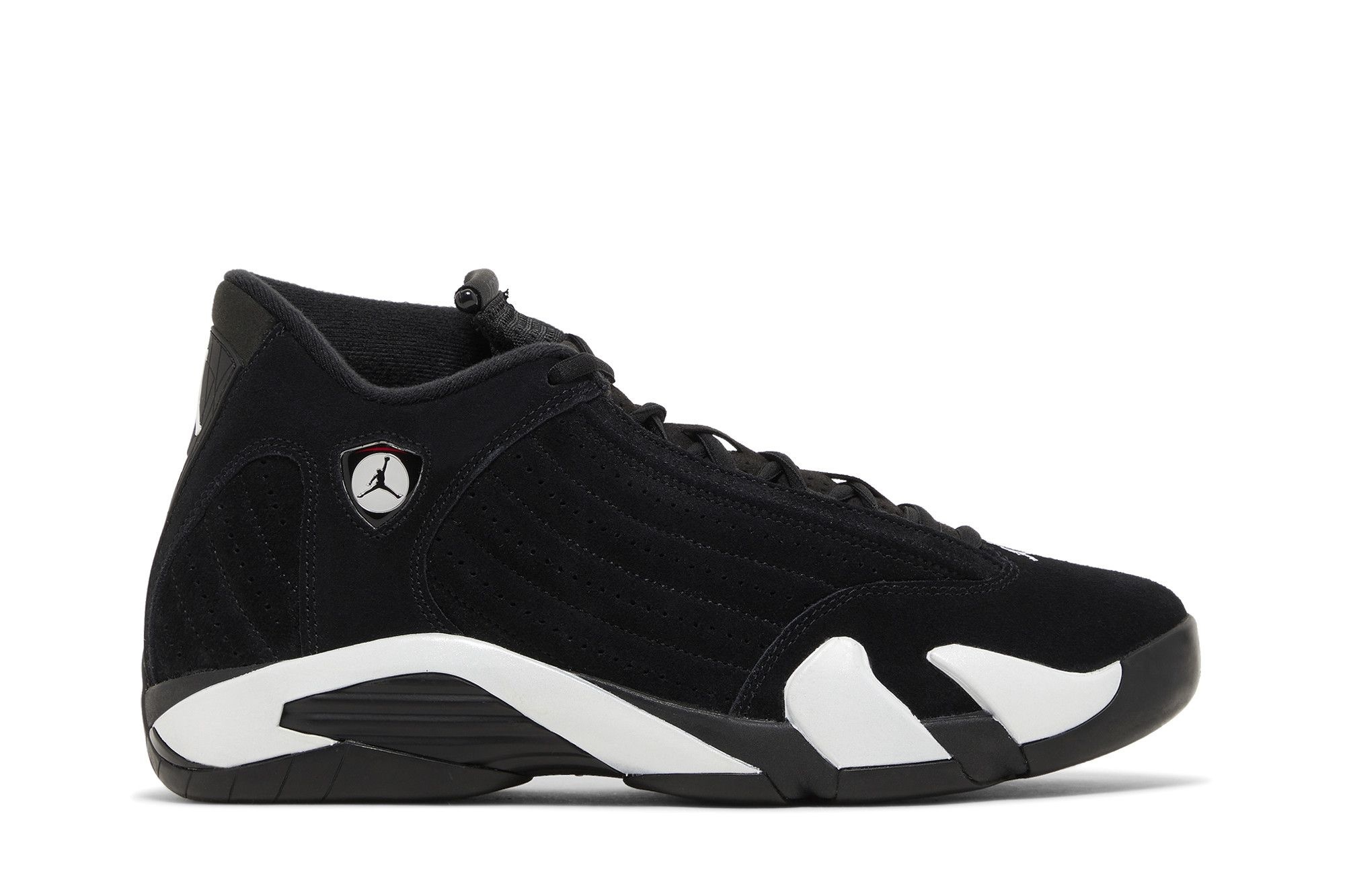 Crafted with premium leather and suede, the Jordan 14 Retro Last Shot boasts sleek, aerodynamic lines inspired by high-performance automobiles. The classic black and varsity red colourway is a nod to the Chicago Bulls, instantly recognisable and undeniably iconic. While eschewing the traditional Swoosh, the shoe proudly displays the Jumpman logo – a symbol of excellence and athletic achievement – in both red and black throughout the design, including the tongue and heel.