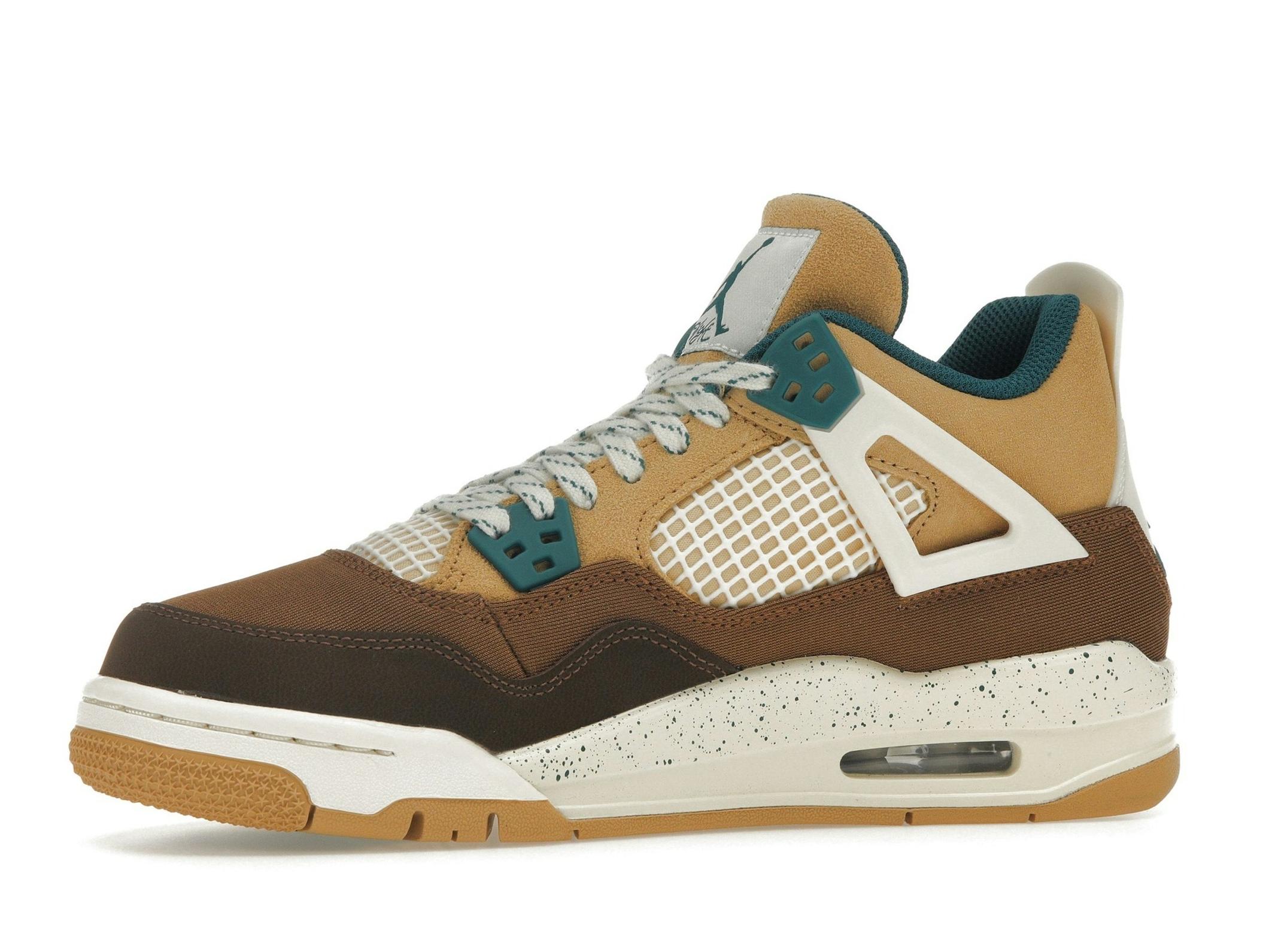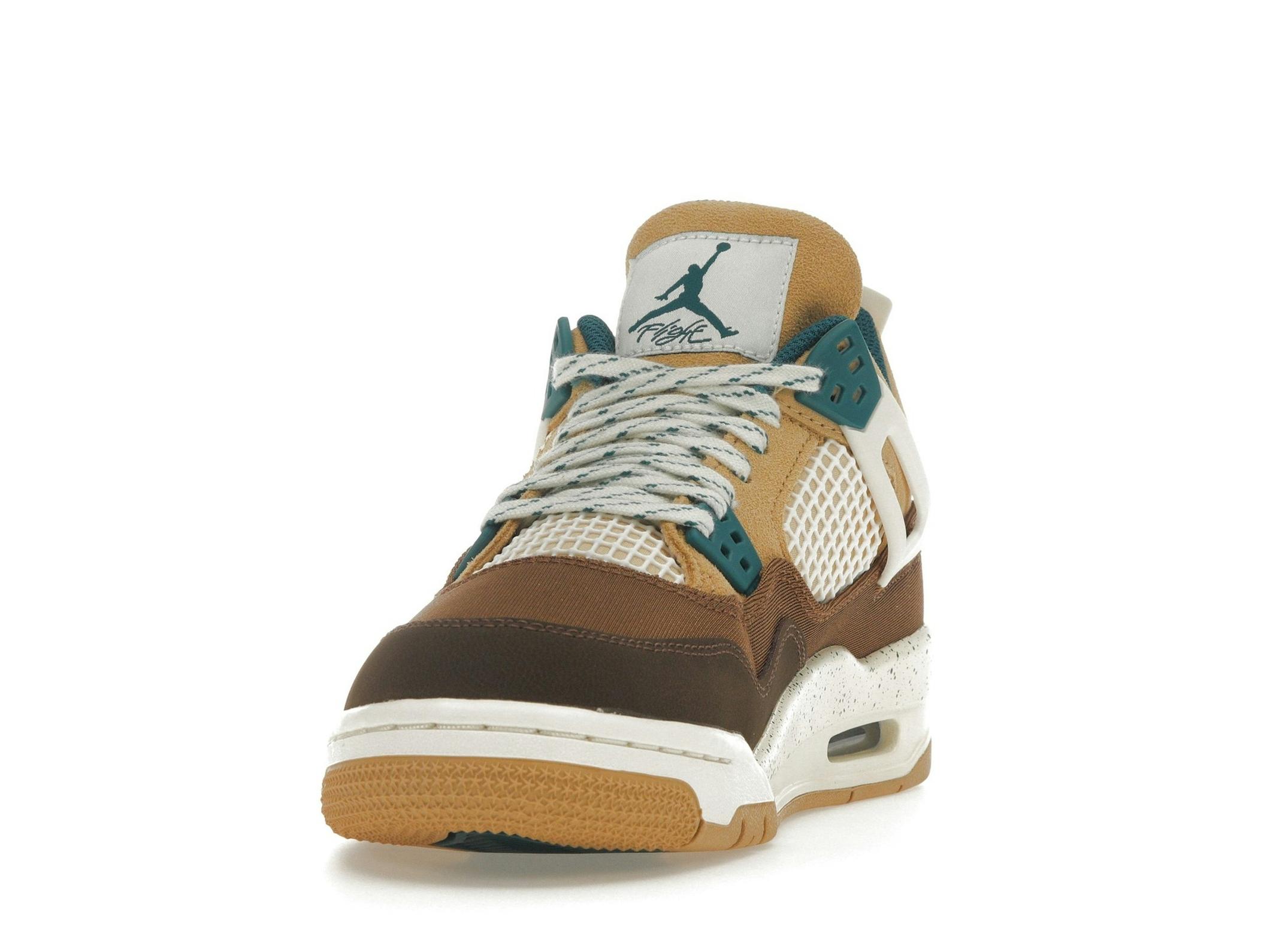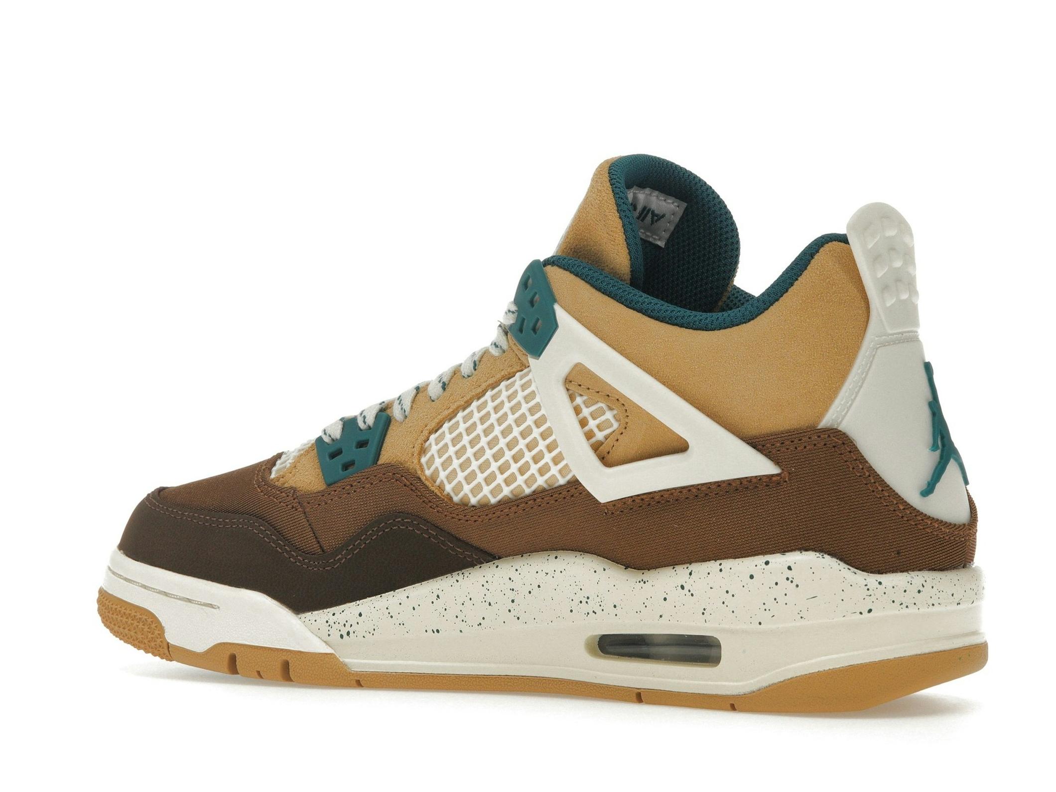 The Jordan 4 Retro Cacao Wow (GS) features a premium construction with a blend of soft suede, breathable mesh, and durable leather overlays. The intricate detailing and layered design add depth and texture, ensuring both comfort and style. This special edition utilizes a rich combination of Cacao Wow, Geode Teal, Ale Brown, Twine, Sail, and Luminous Green, creating a visually appealing and earthy aesthetic.