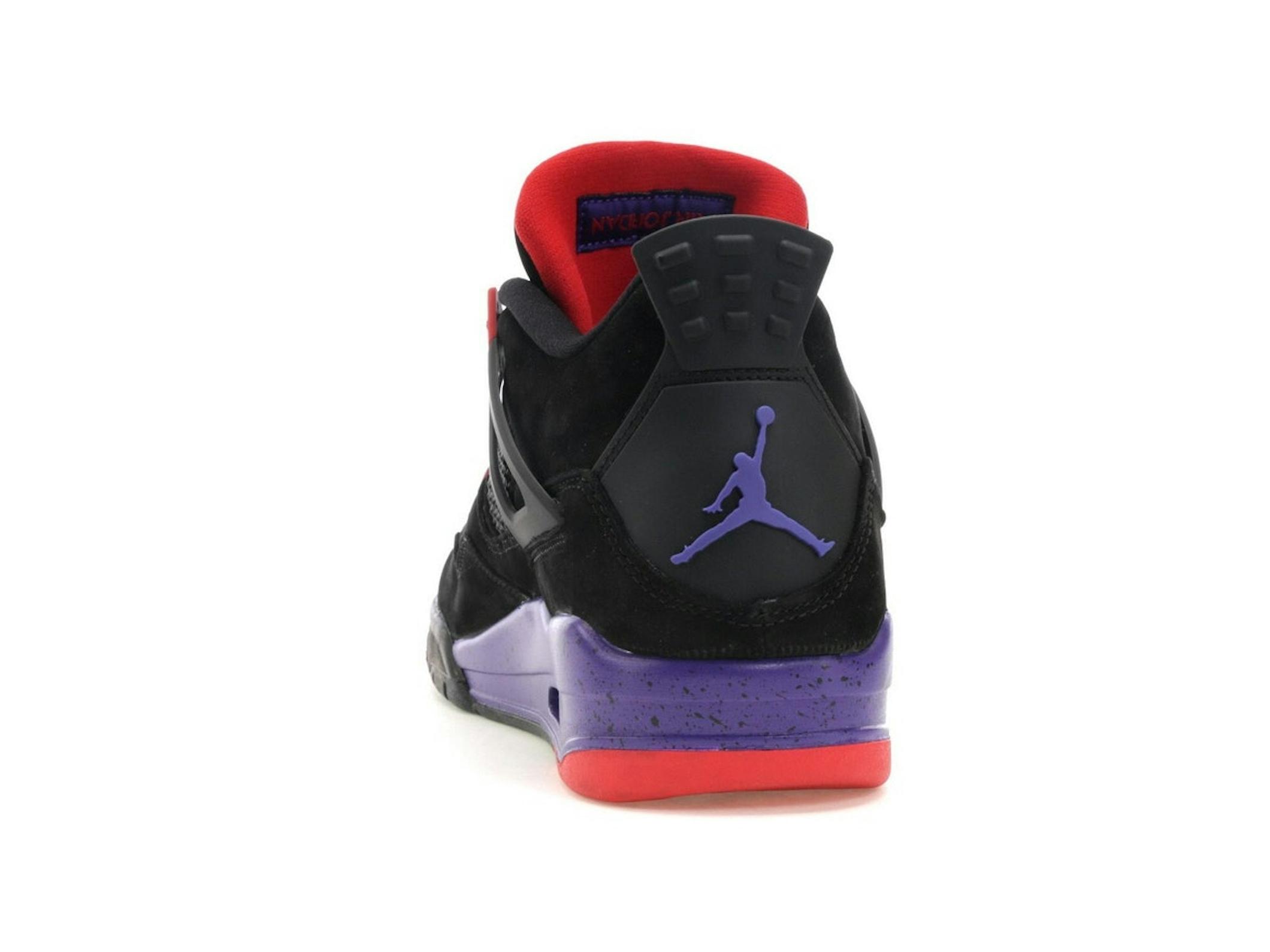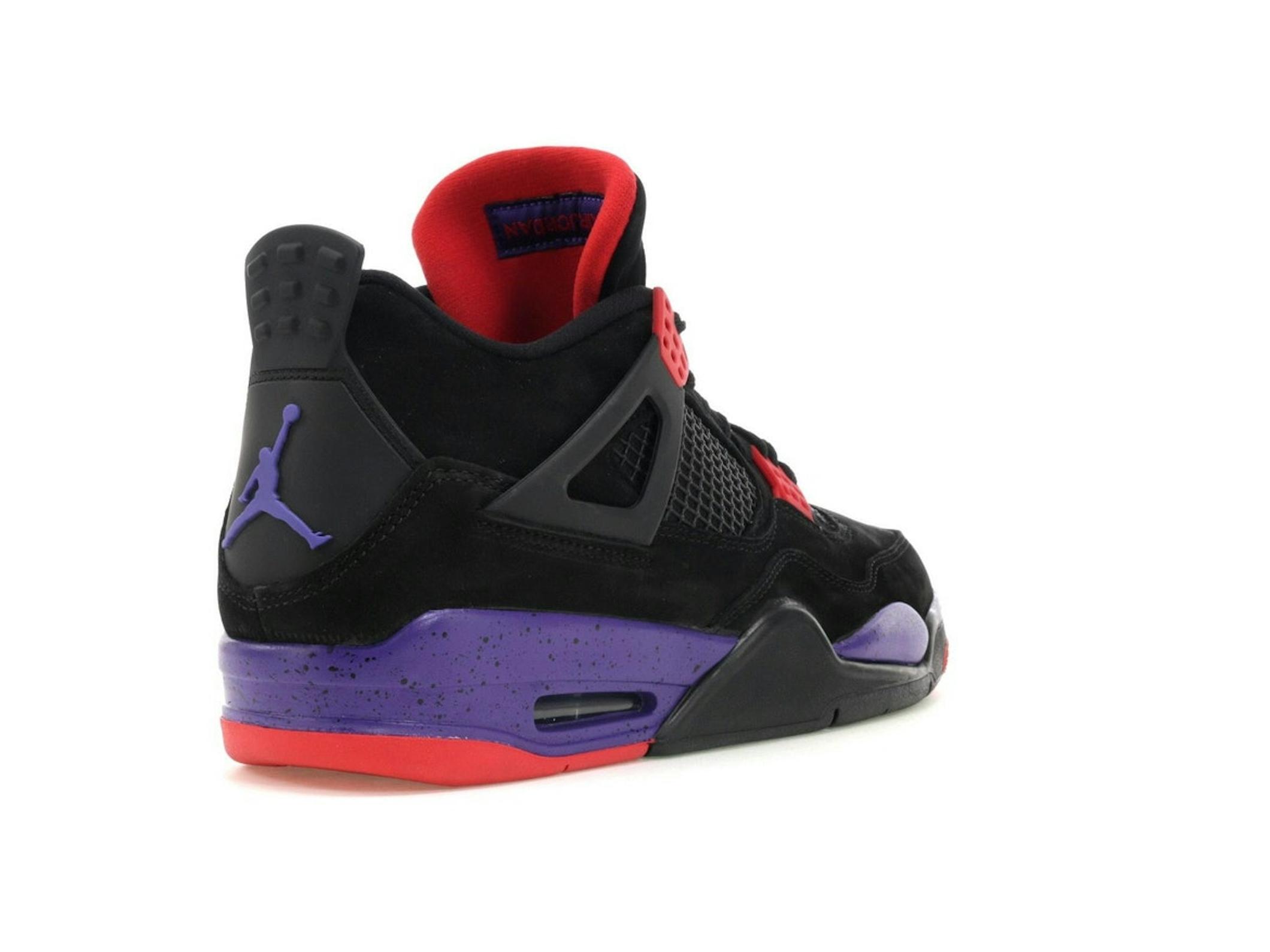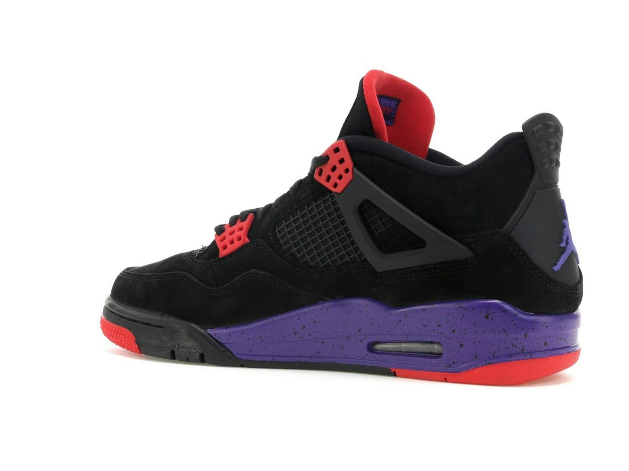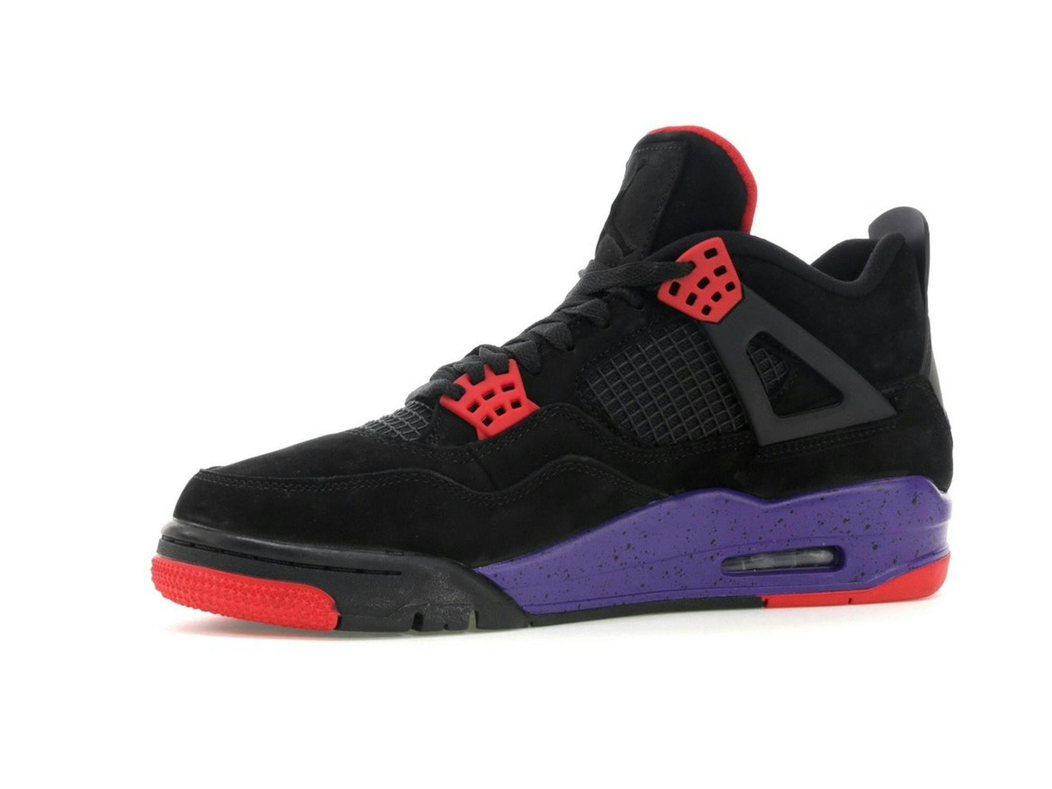 The Jordan 4 Raptors features a premium black suede upper, providing a luxurious feel and a sleek look. Court purple and university red accents create a striking contrast, adding pops of color that make this shoe stand out. The signature paint splatter detailing on the midsole further enhances its distinctive design.