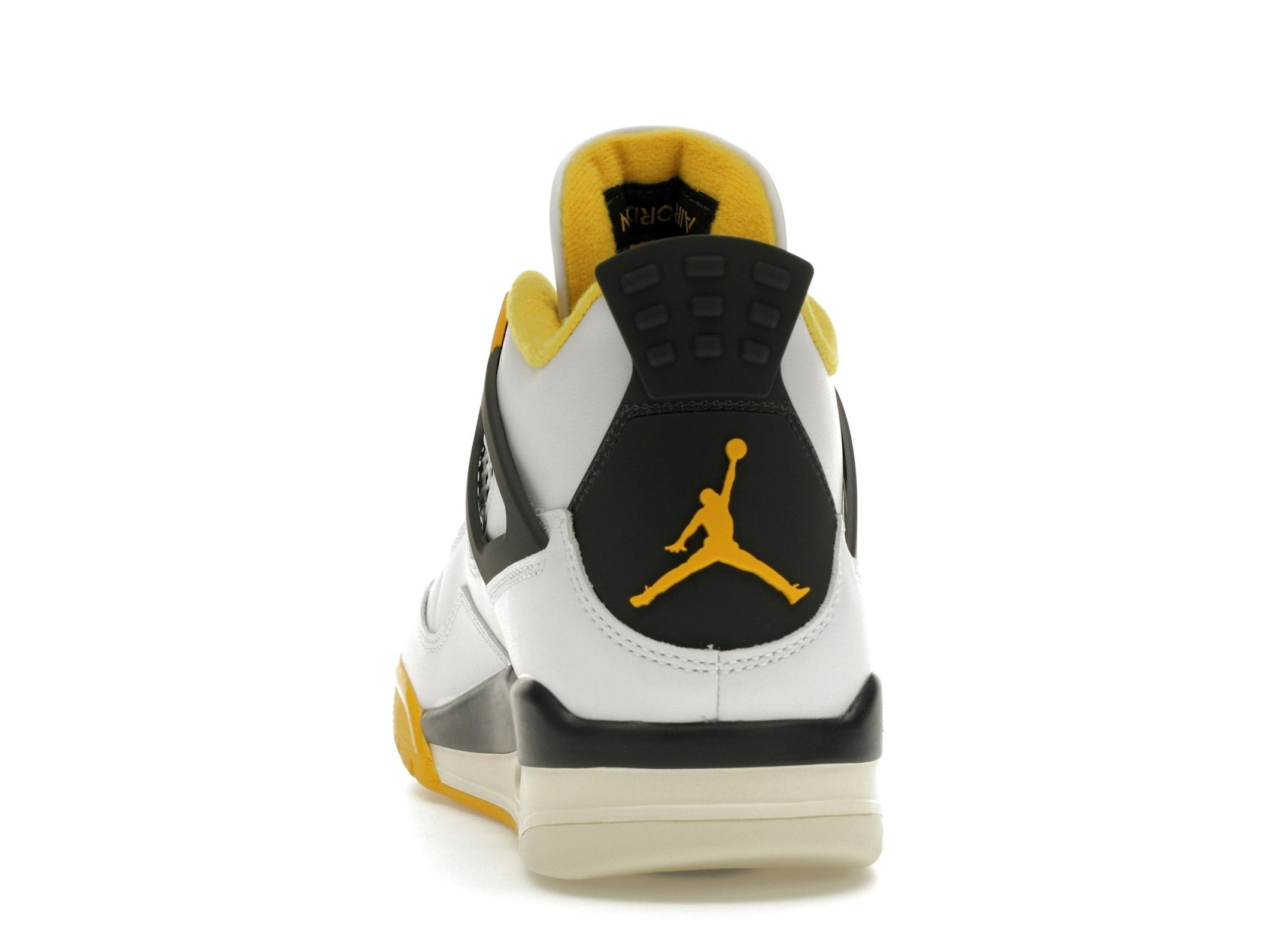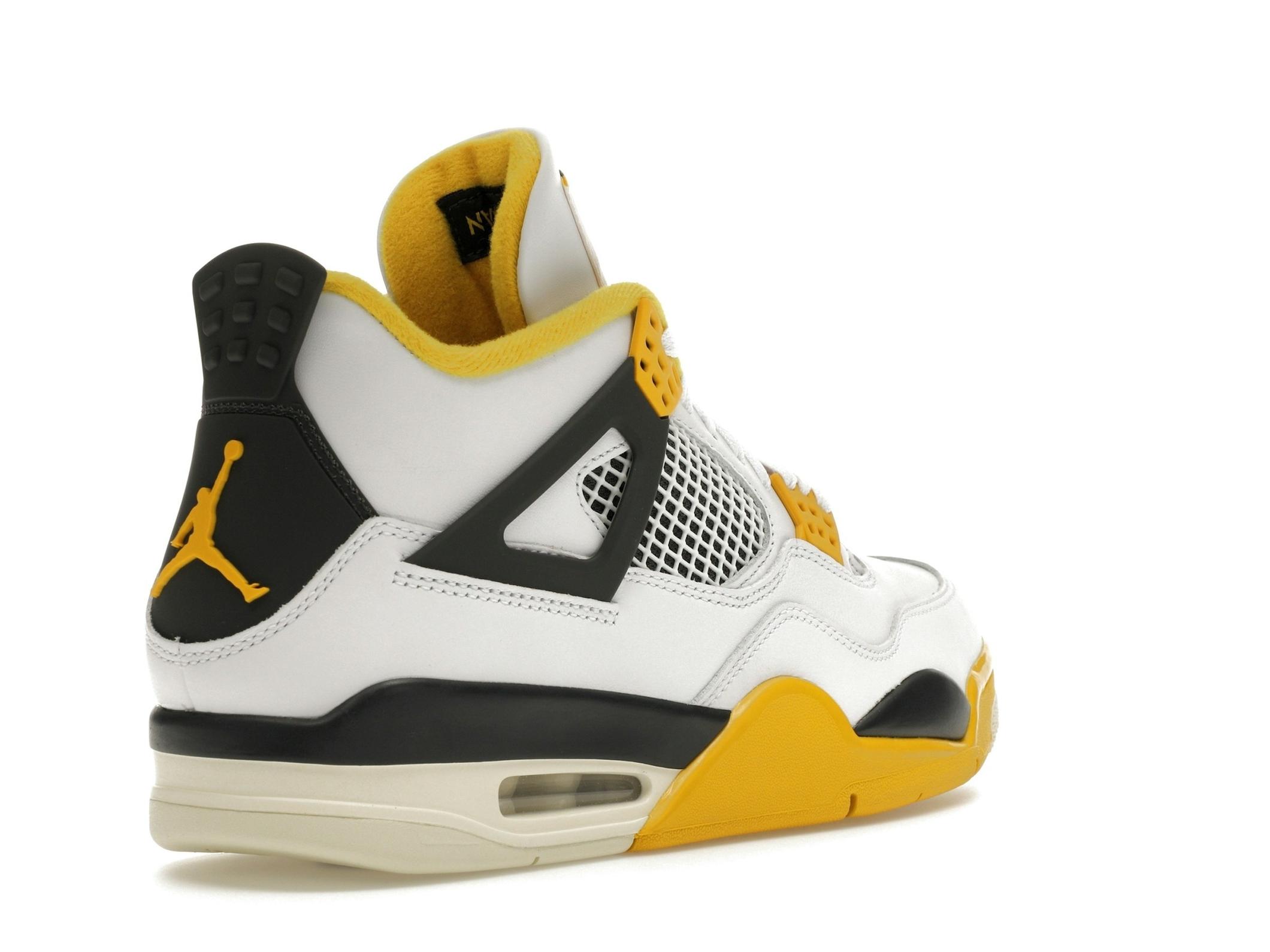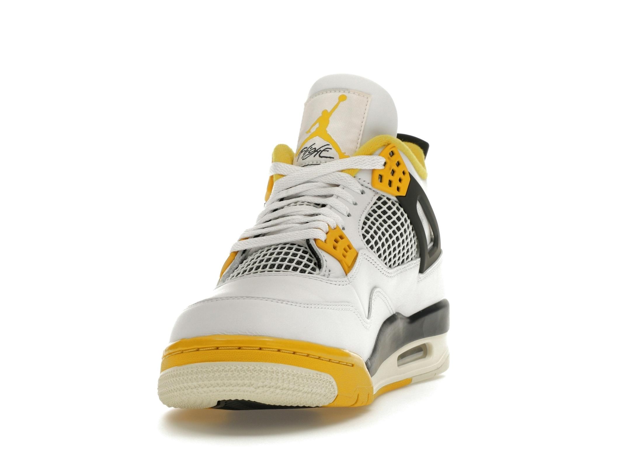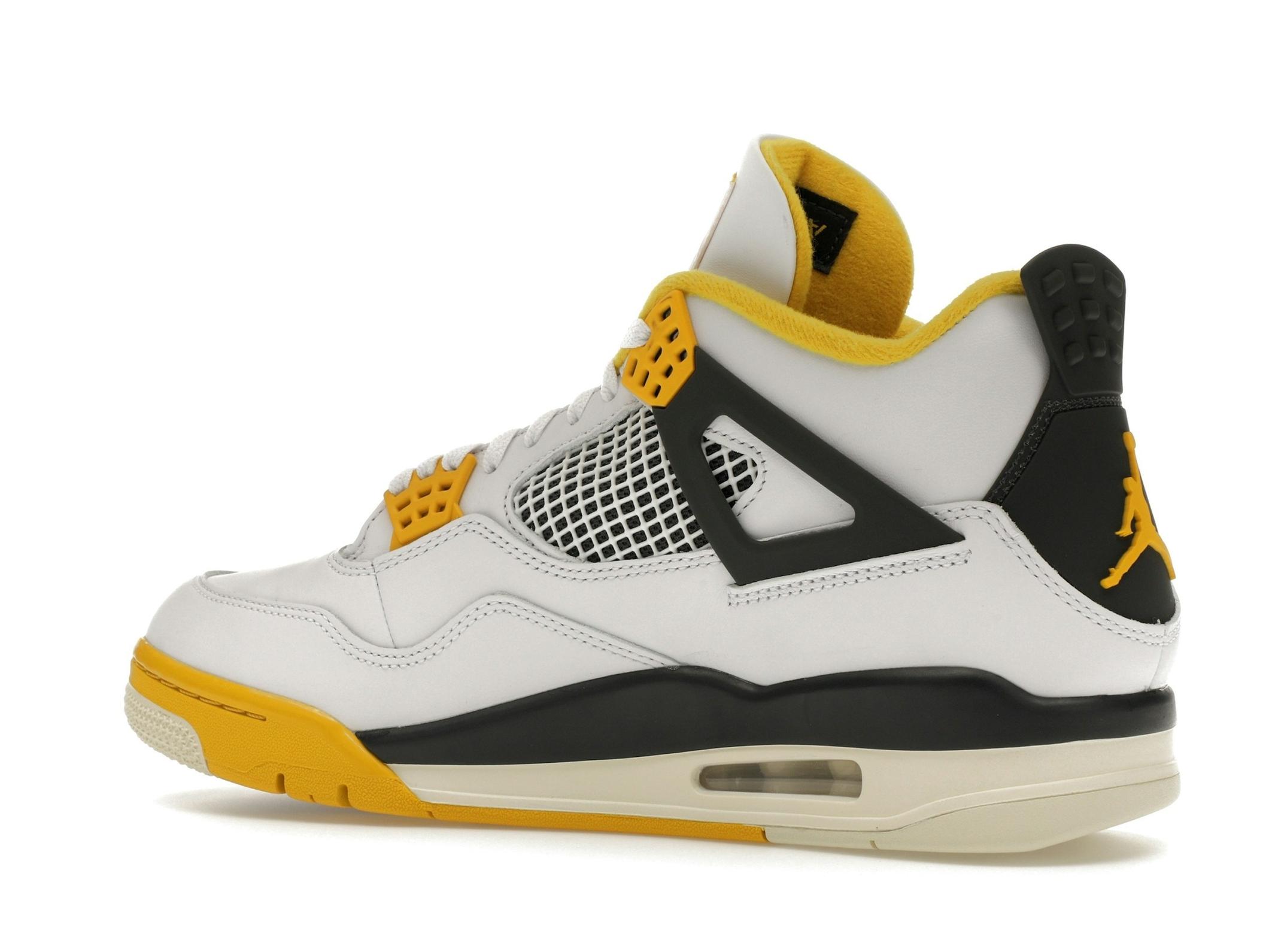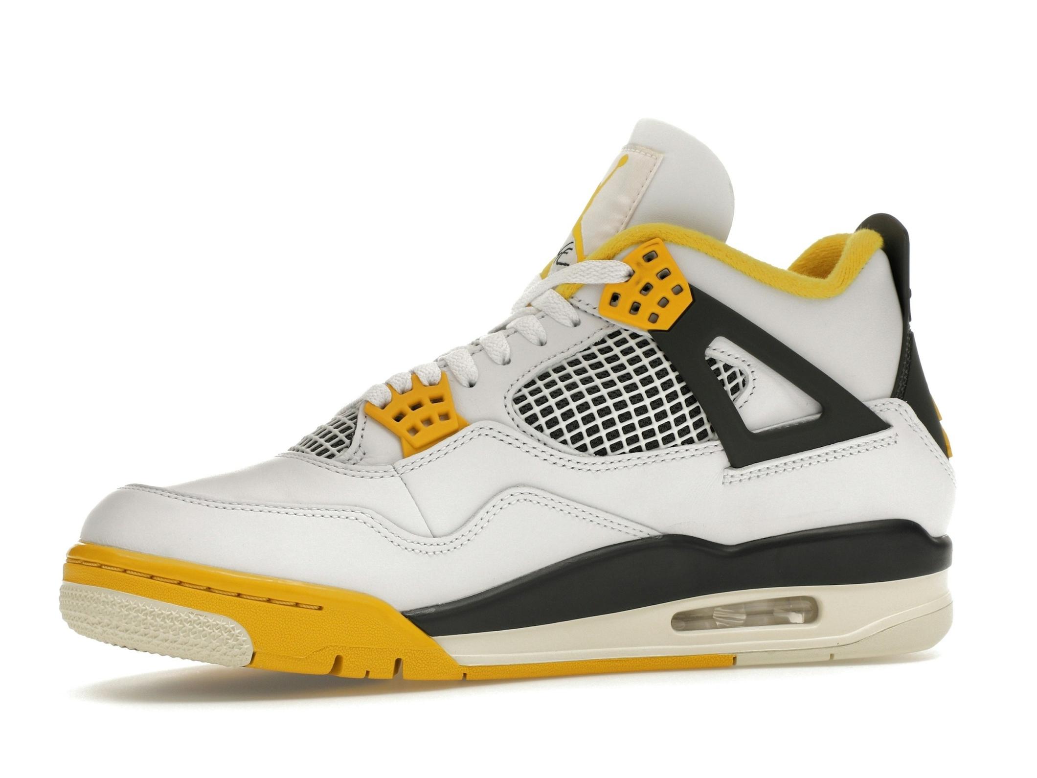 The Jordan 4 Retro Vivid Sulfur features a clean white upper complemented by subtle coconut milk accents. The vibrant sulfur detailing on the lace crowns and midsole provides a striking contrast, adding a pop of color that elevates the overall design. This sneaker is a testament to the iconic Jordan 4 design, known for its distinctive mesh quarter panels, unique wings, and innovative lacing system.