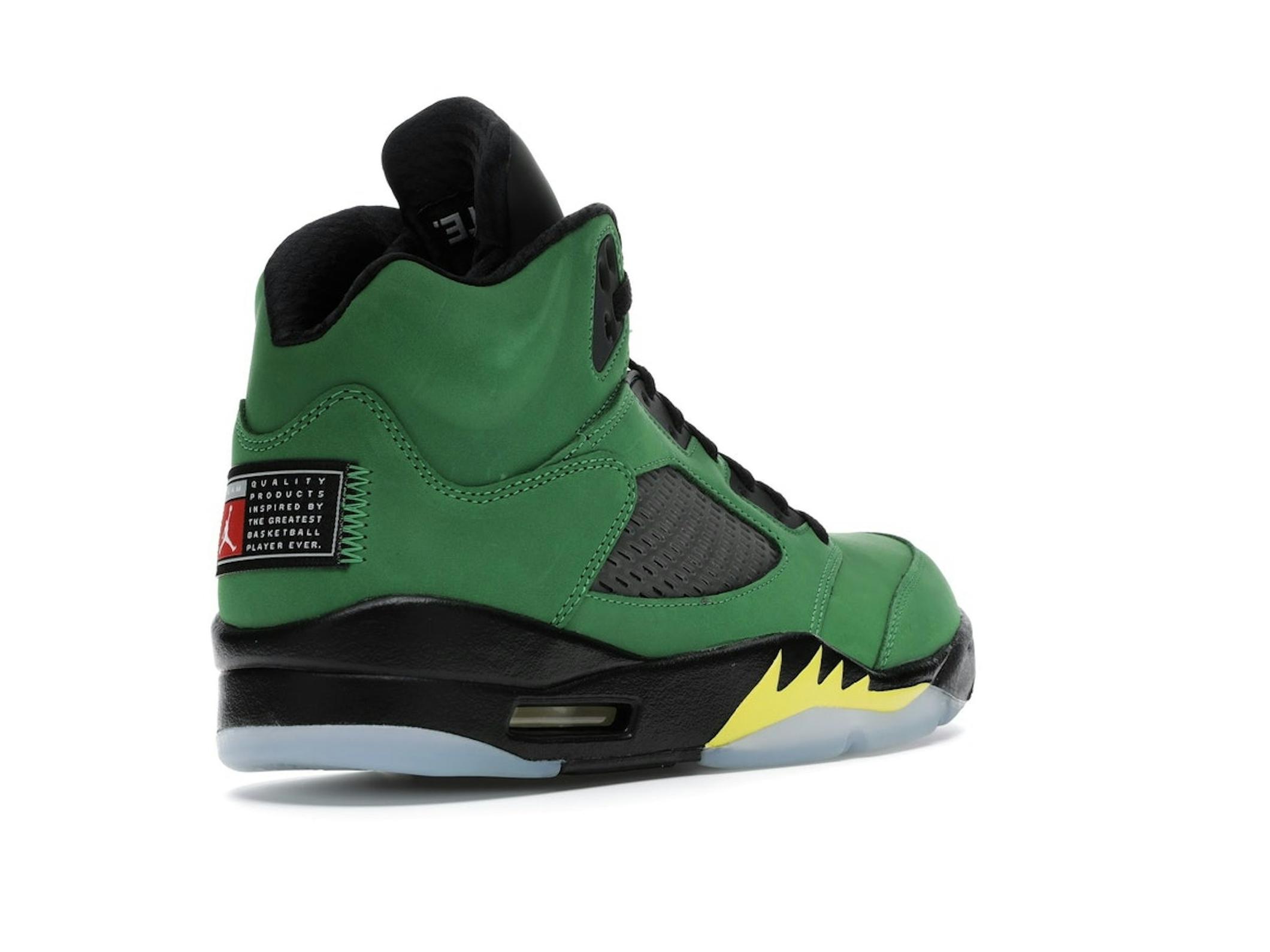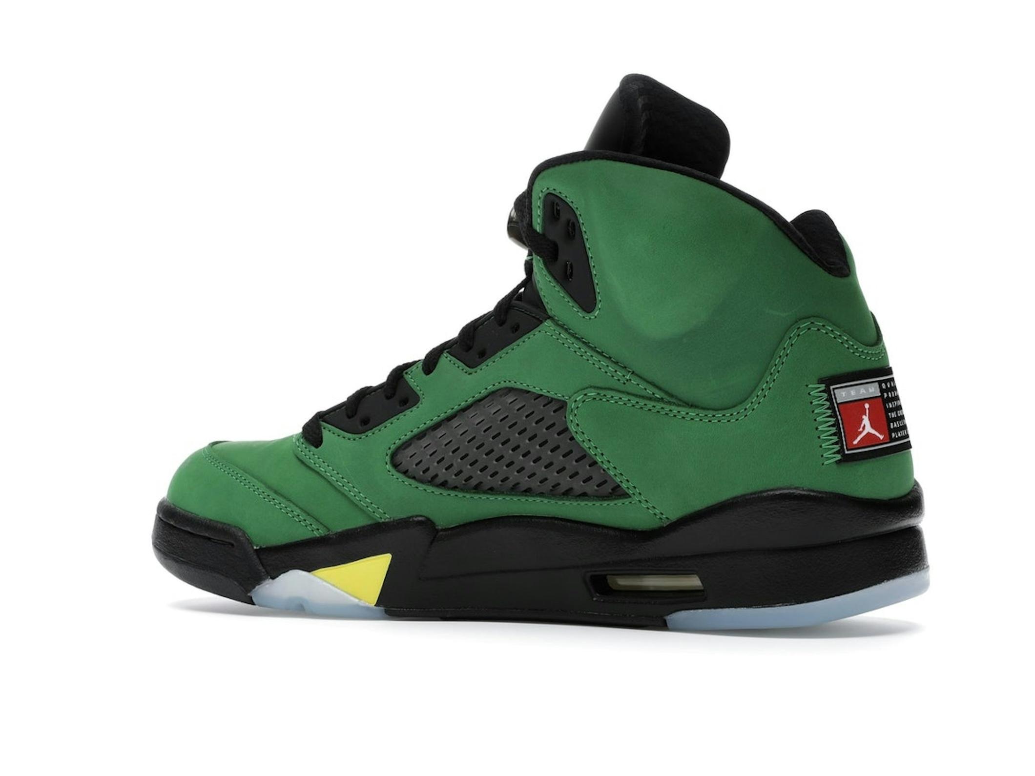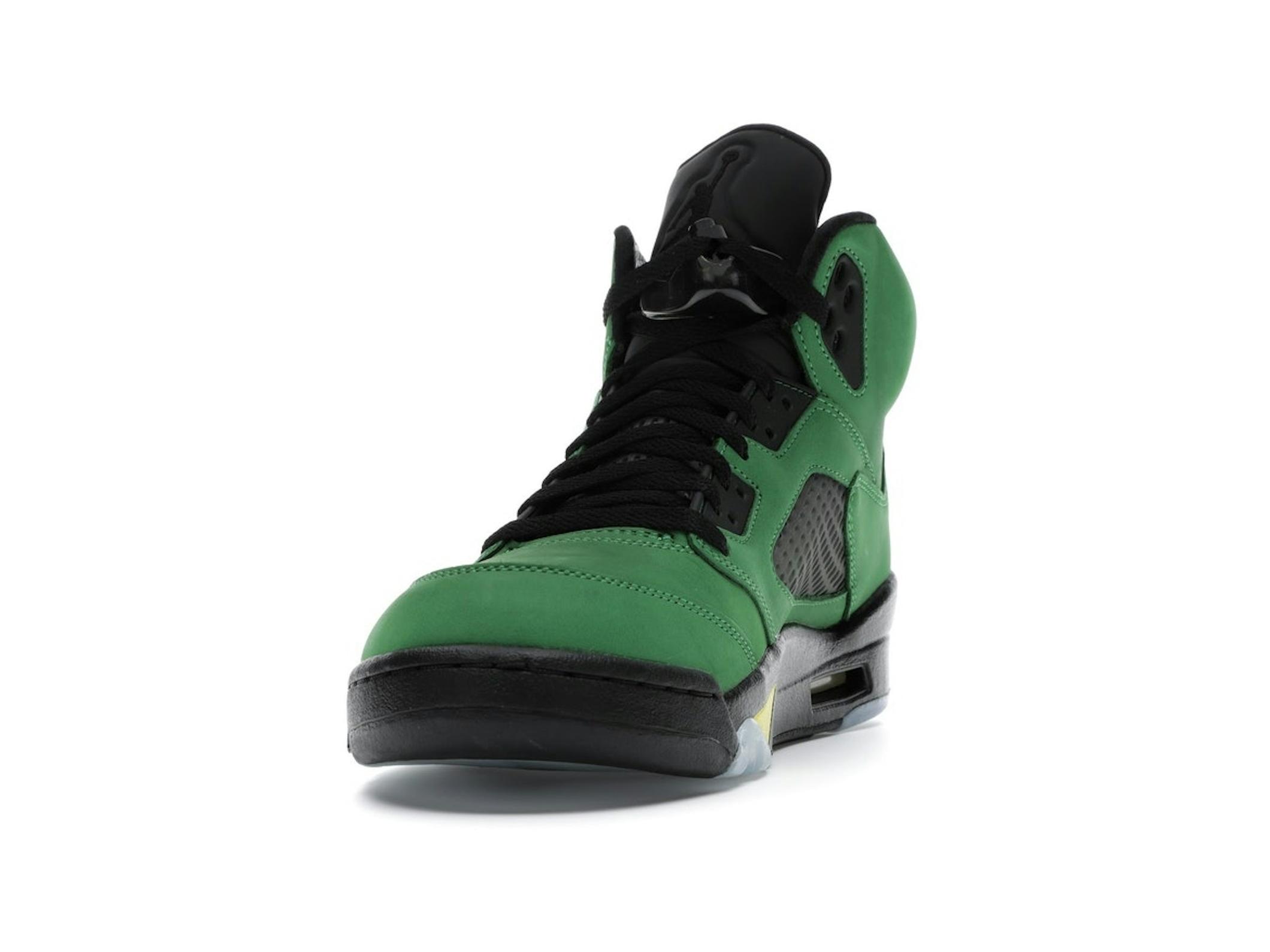 Step up your sneaker game with the iconic Jordan 5 Retro SE Oregon, a tribute to collegiate legacy and superior style. This striking sneaker features a vibrant Apple Green Durabuck upper, accented with bold black and yellow strike details, capturing the spirit of Oregon athletics.