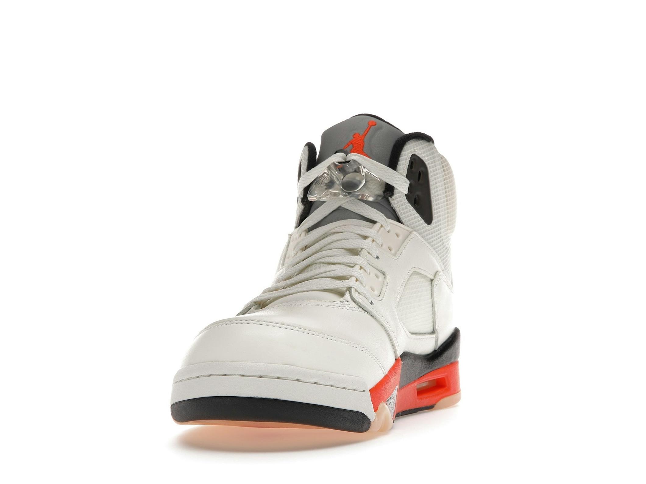 The Jordan 5 Shattered Backboard features a clean white leather upper contrasted by vibrant orange accents, capturing the essence of the original Shattered Backboard theme. Unlike traditional Jordan 5s, this iteration showcases translucent mesh on the quarter panels and tongue, offering a modern twist and enhanced breathability.