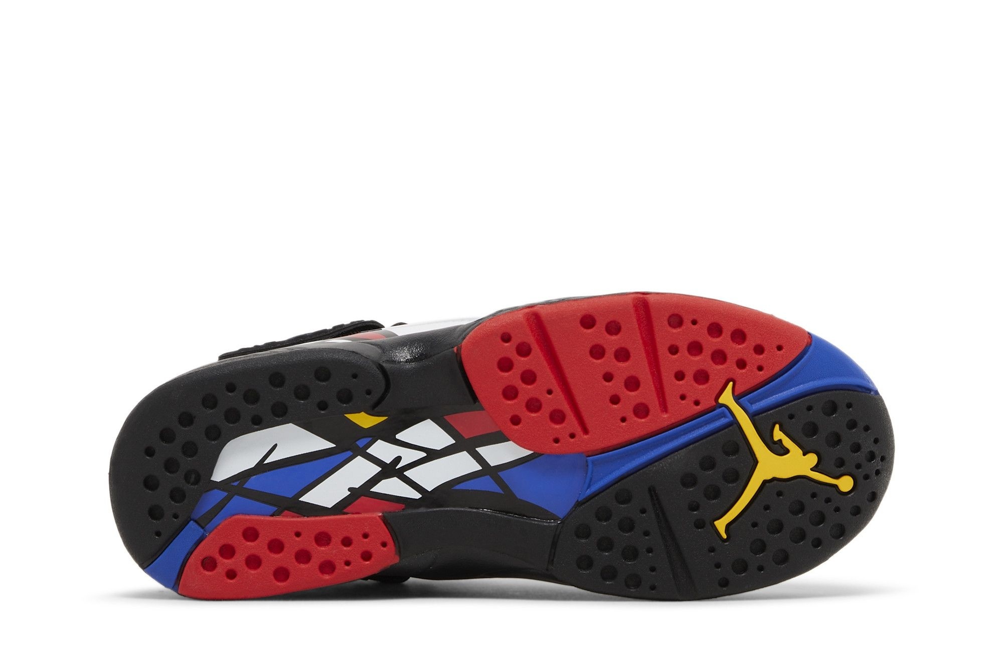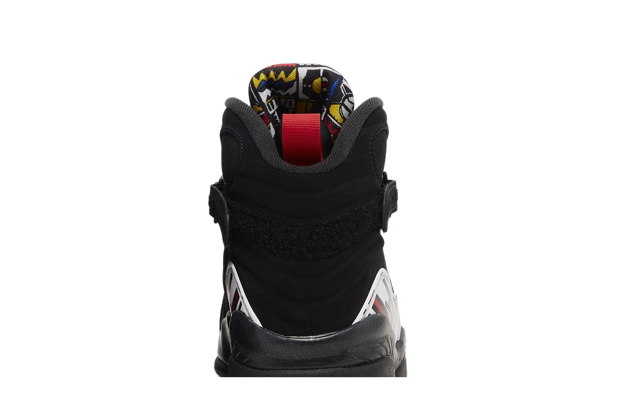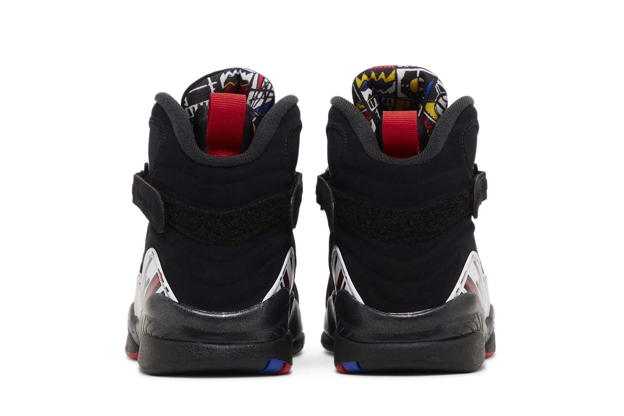 Sporting a classic Black, True Red, and White colourway, these Jordan 8 Retro Playoffs (GS) sneakers feature a premium black nubuck upper. Bold graphic details on the mudguard and outsole add a vibrant touch, while the underside showcases eye-catching primary colour patterns and the iconic Jumpman logo. The comfortable cross-strap ensures a secure and snug fit, perfect for both on and off the court.
