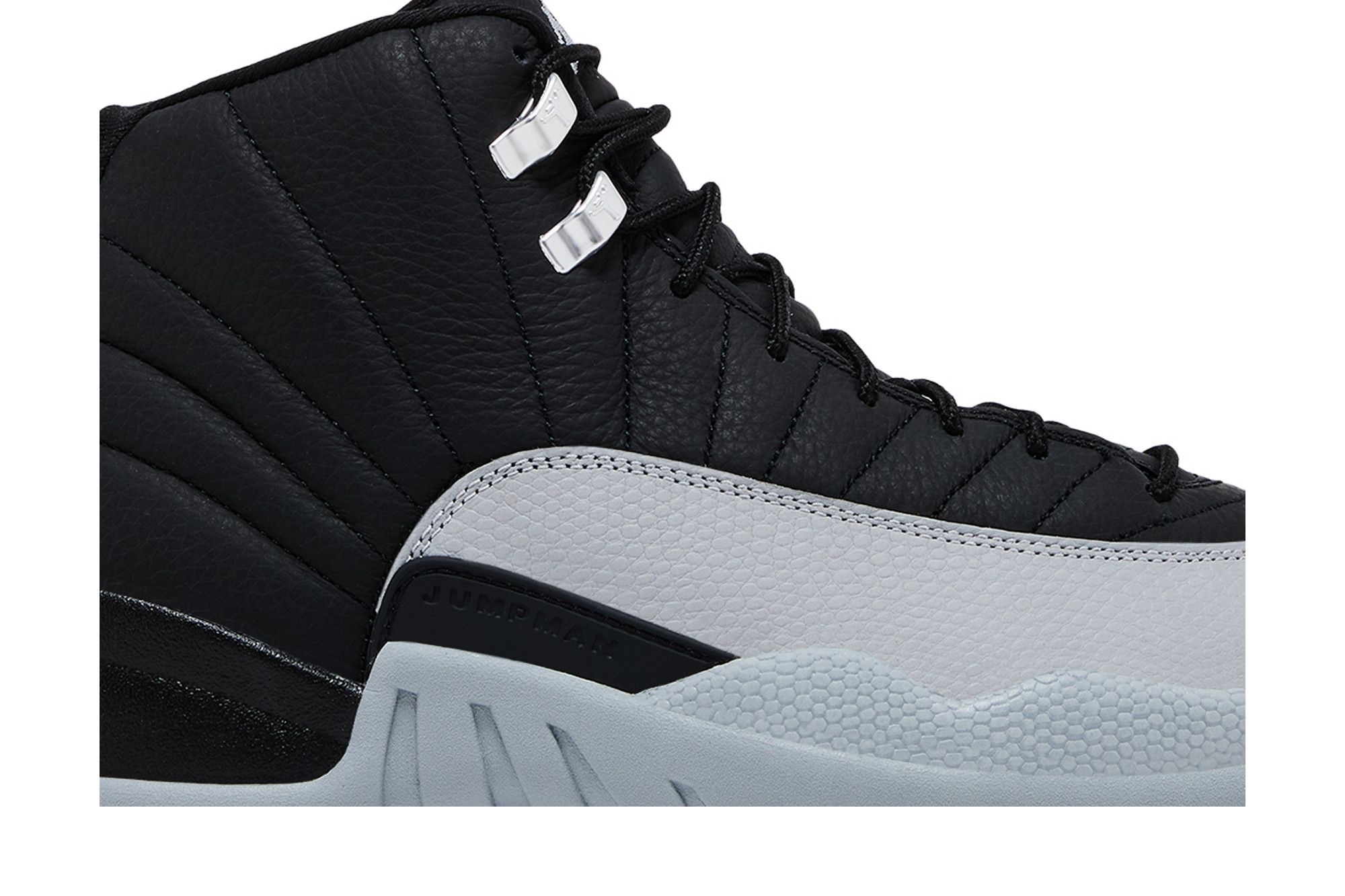 The Air Jordan 12 Retro Playoffs 2012 boasts a striking colour combination of black, white, and true red. The premium black leather upper provides a luxurious feel, complemented by textured white mudguard overlays for added durability and style. Metallic silver lace eyelets add a subtle touch of shine, enhancing the overall sophisticated aesthetic.