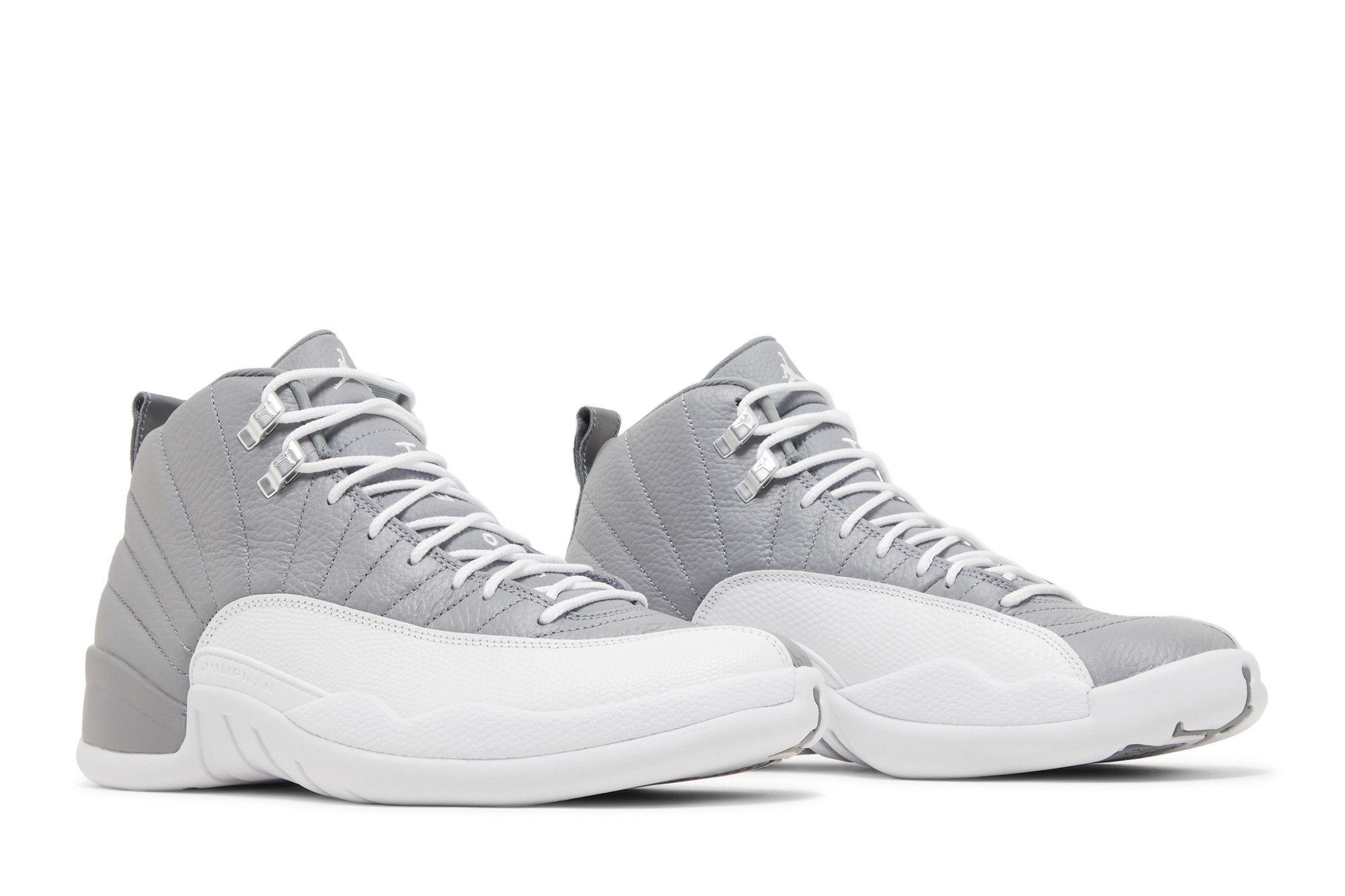 The stealthy colorway features a premium crushed grey leather upper, accented by a striking white lizard-textured overlay. These overlays add a touch of luxury and visual interest, complementing the Air Jordan 12’s signature stitching. The iconic Jumpman logo proudly sits on the heel tab and tongue, showcasing the heritage of this renowned silhouette.
