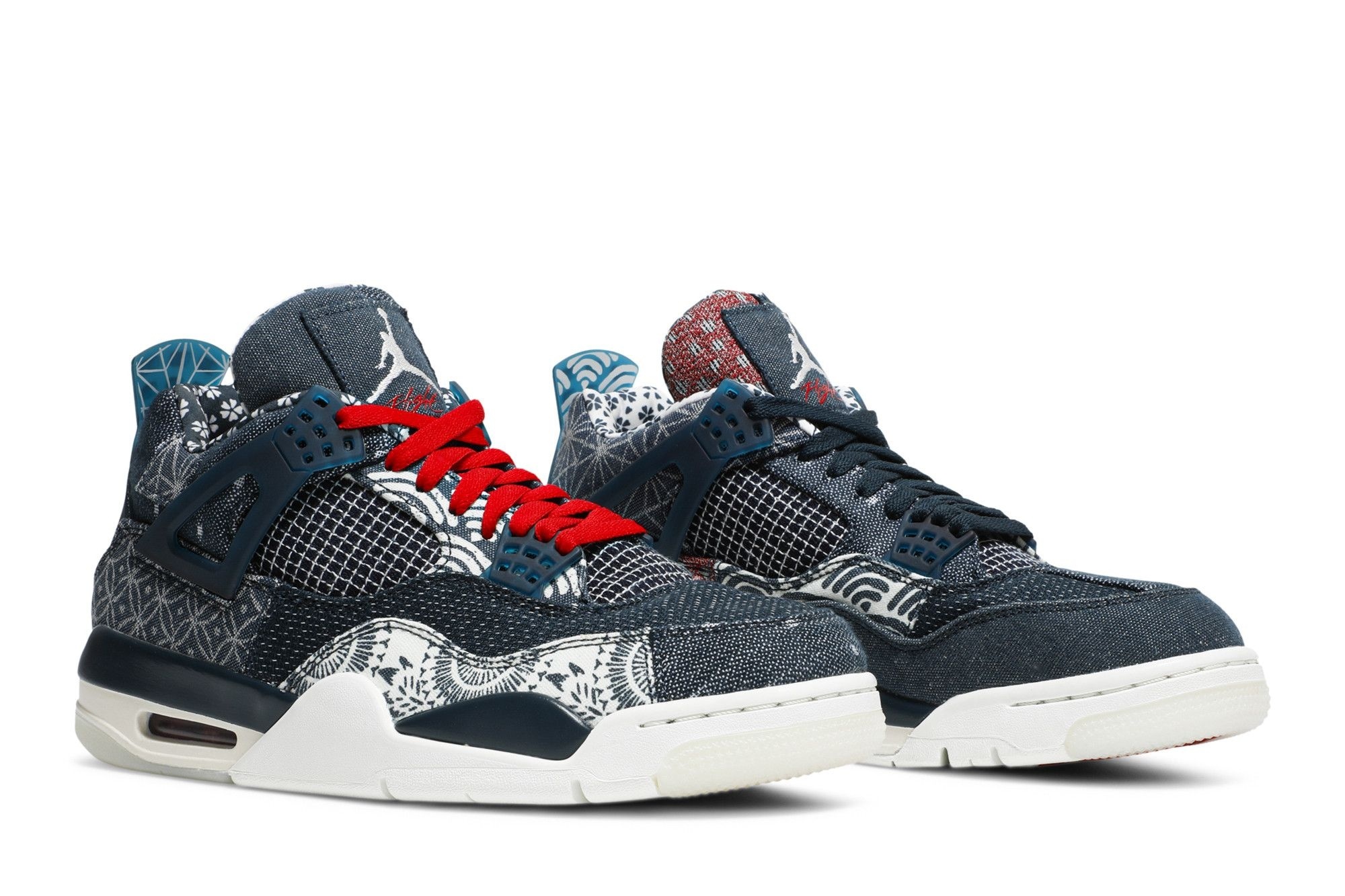 Experience the unique style and comfort of the Air Jordan 4 Retro SE Sashiko sneakers. These Deep Ocean/Sail-Cement Grey-Fire Red kicks (CW0898-400) boast a striking design that blends modern aesthetics with classic Air Jordan heritage. The quilted patchwork upper creates a rich, textured look reminiscent of both twill and canvas, offering a sophisticated twist on the iconic silhouette.