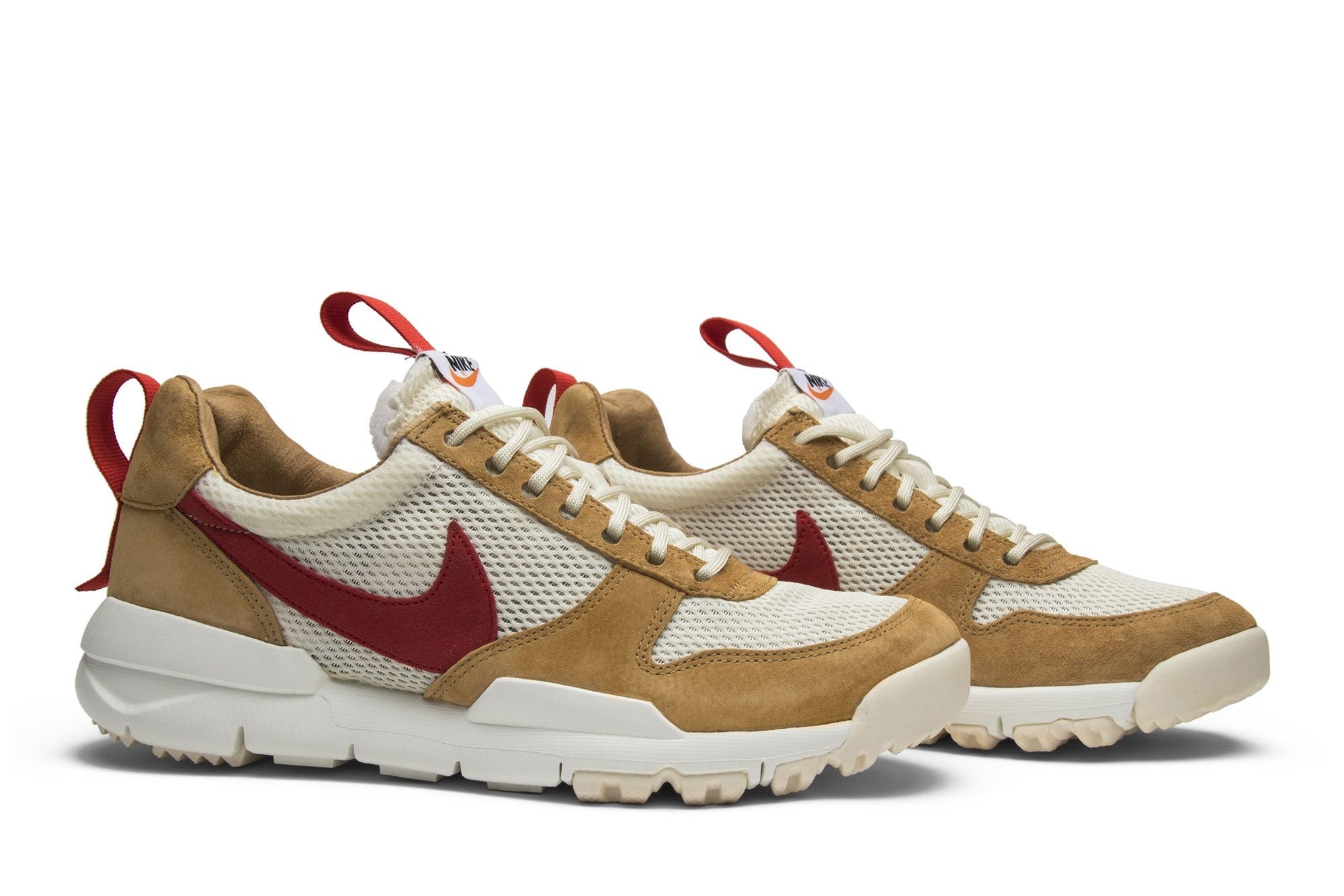 NikeCraft Mars Yard Shoe 2 Tom Sachs Space Camp (AA2261-100). Limited edition sneakers in Natural/Sport Red-Maple. Breathable mesh & durable nubuck. Exceptional comfort & traction. Nike’s innovative design.