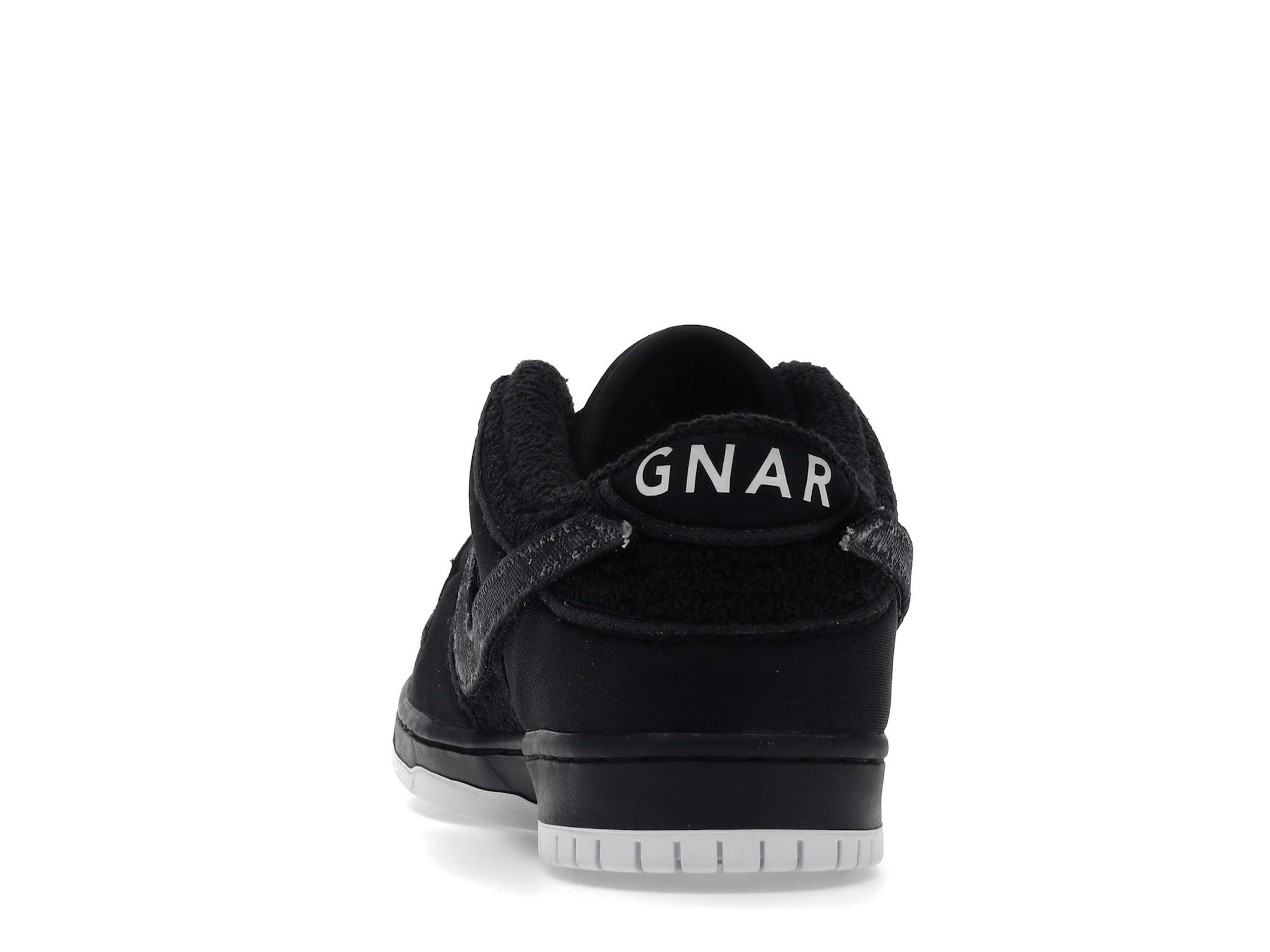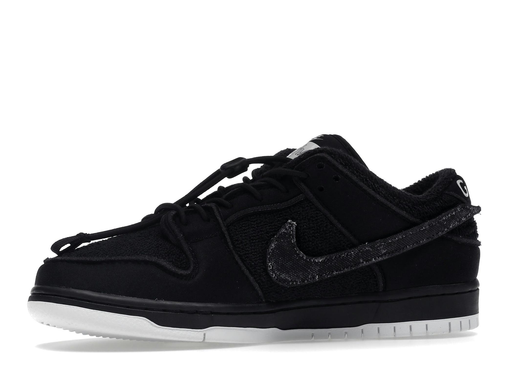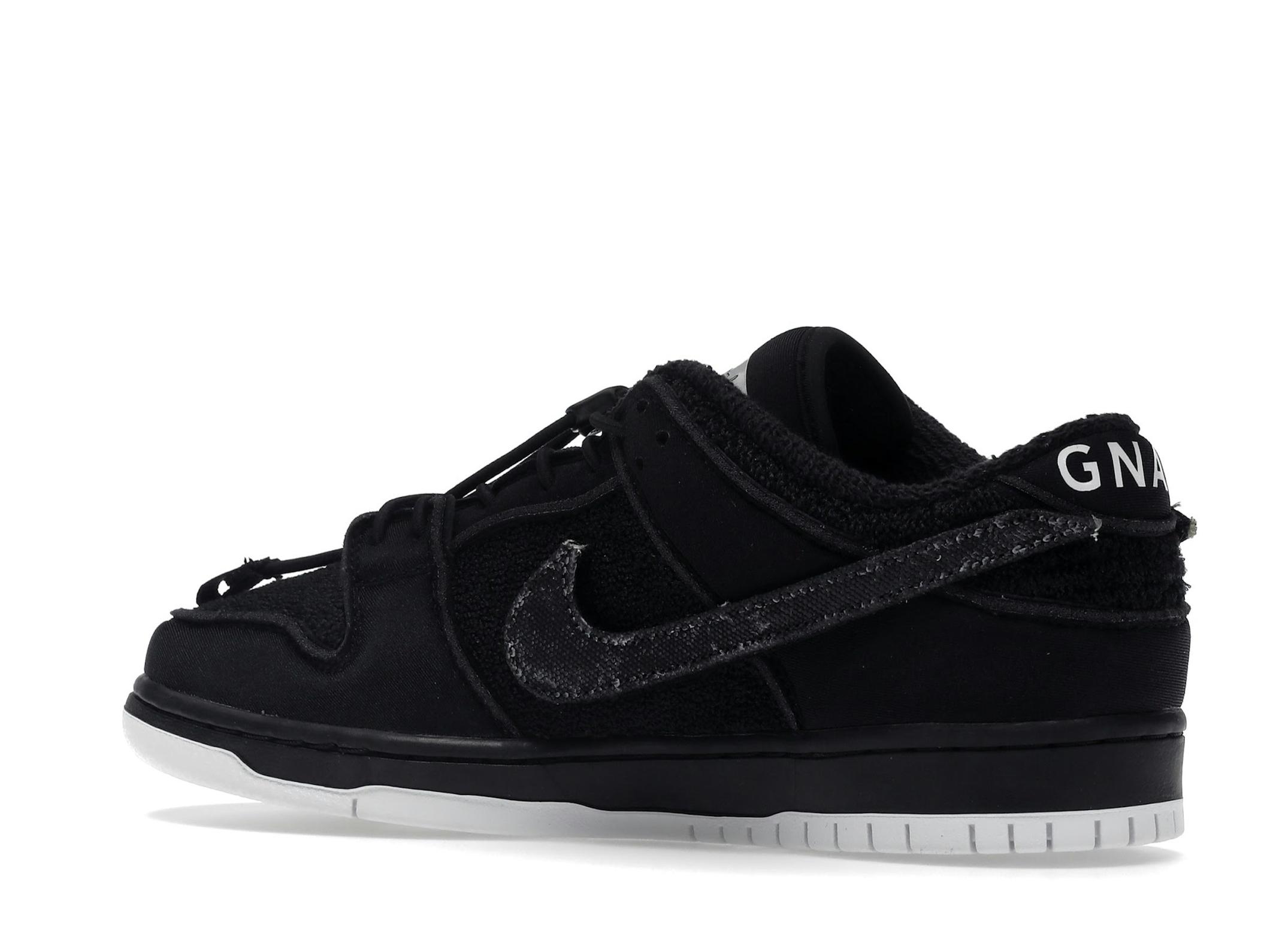 Featuring a predominantly black color palette, the Gnarhunters Dunk Low utilizes a combination of materials including terry cloth and padded nylon for a comfortable and textured feel. The design incorporates removable velcro Swooshes, offering customizable style options. The bungee-style cord laces further enhance the shoe’s distinctive look, adding a touch of ruggedness.