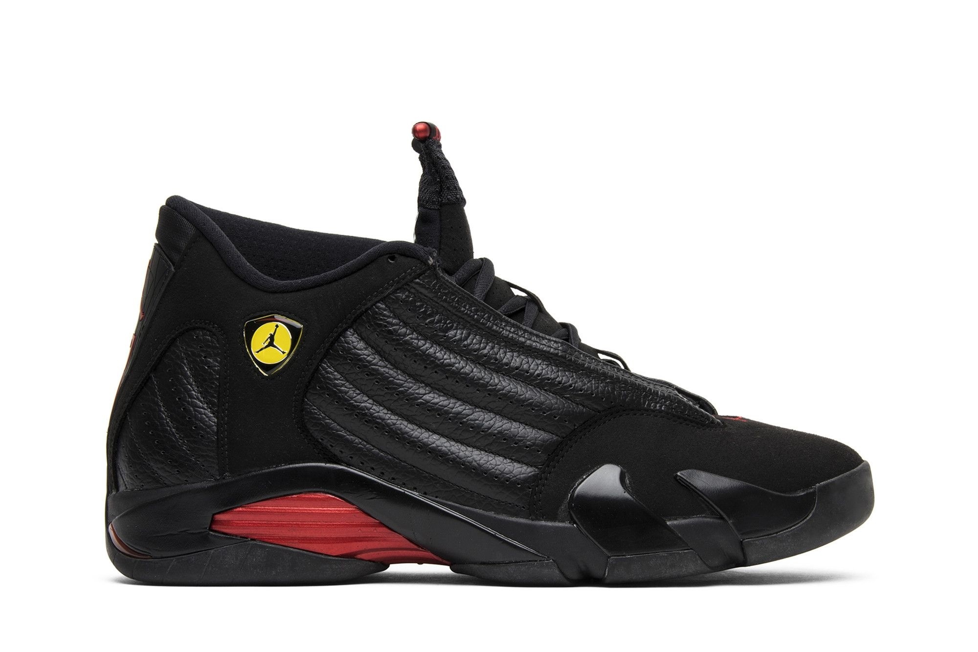 Jordan 14 Retro Last Shot (2011) sneakers. Black/Varsity Red. MPN: 311832-010. Commemorates MJ’s iconic 1998 Finals shot. Premium leather & suede. A must-have for collectors & sneakerheads.